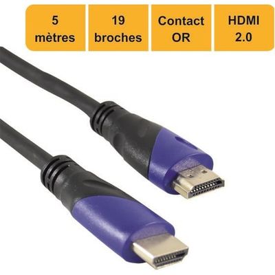 La transmission de signaux audio et vidéo de qualité numérique de haute qualité. Câbl HDMI™ haut vitss, mâl - mâl, 8K, doré, 2,0 m au millur prix Câble HDMI avec Ethernet pour le transfert de signaux audio et vidéo de haute qualité avec la meilleure résolution UHD. Cable Hdmi 5m EMOS Câble HDMI 2.0 Haute Vitesse Avec Ethernet 3 M 18 Gbps High Speed Cable Avec Ultra HD 4K 3D Prise Hdmi Convient également pour : téléviseurs, écrans, Xbox, Playstation, ordinateur, ordinateur portable, projecteur, home cinéma, lecteur DVD et Blu-ray, écrans OLED / LED / LCD / TFT, etc. Câble entièrement blindé pour réduire les interférences électromagnétiques. Débit de données élevé jusqu'à 18 Gbit/s pour une compatibilité avec des... Longueur du câble : 0,75 m Débit de données élevé jusqu'à 18 Gbps pour une compatibilité avec des appareils de haute qualité Câble entièrement blindé pour réduire les interférences électromagnétiques.