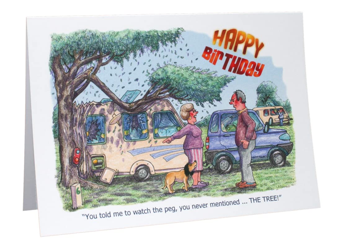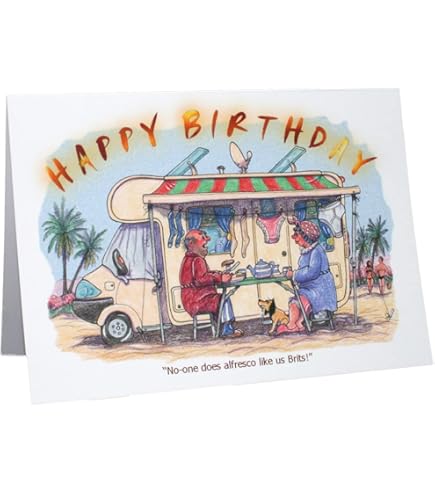 Ces originaux ont été exposés et vendus au Royaume-Uni, en Europe et aux États-Unis. CARTE ANNIVERSAIRE CAMPING-CAR carte anniversaire carte de vœux bus... CARTE ANNIVERSAIRE CAMPING-CAR carte anniversaire carte de vœux bus Format A5 standard : 12 x 14,8 cm Carte De Vœux « Scène De Brousse Aquarelle Caravane Campeur Rétro Carte de voeux amusante A5 avec humour en camping-car pour Noël, par Armand Foster La carte de vœux vierge A5 pour camping-car est livrée avec une enveloppe blanche enveloppée dans du cellophane et envoyée dans une enveloppe rigide. Inscription : « No one does alfresco like us Brits!, »