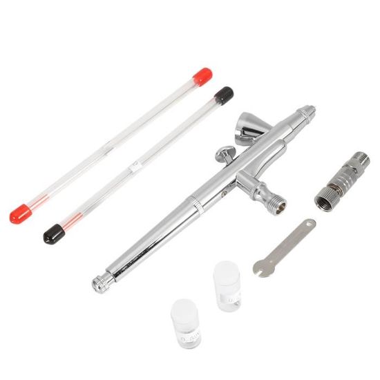 Système d'alimentation:Gravité / aspiration Pression de service:15 - 50 PSI Capacité du godet:7 ml Capacité du bocal en verre:22 ml Diamètres des buses:0,2 / 0,3 / 0,5 mm Diamètre de l'aiguille:0,2 / 0,3 / 0,5 mm Longueur du tuyau d'air:1,8 m Adaptateurs:G1/4 - G1/8 Livré dans une boîte en plastique Contenu de la livraison: 1 x pistolet aérographe avec une buse et une aiguille de 0,3 mm 1 x tuyau d'air 1 x clé 1 x pipette 2 x buse interchangeable (0,2 / 0,5 mm) 2 x aiguille interchangeable (0,2 / 0,5 mm) 1 x bocal en verre 1 x réservoir en métal Le pistolet vous permet de contrôler la quantité d'air et la couleur selon vos souhaits en appuyant et en tirant le levier. Le matériau de haute qualité est résistant aux solvants et aux produits chimiques des peintures. Voici des exemples de produits que vous pourrez trouver : pinces coupantes, pots de peintures, cabines de peinture modulables, pièces détachées, masquages et même des packs aérographes Kit aérographe pour décoration de gâteaux, pulvérisateur de Peinture 800 W, aérographe à gâteau avec buse de pulvérisation et Bobine 800 ML pour pâtisserie... Aerographe Kit Kit Aérographe Débutant Avec Colorant Et Cabine – COOK FIRST Aerographe Harder And Steenbeck Mgs33 Kit de 160 pièces pour fête Les Anniversaires ,fêtes, soirées