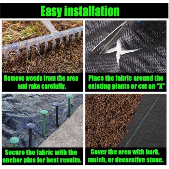 Lutte contre les ravageurs: En empêchant la croissance des mauvaises herbes, les toiles peuvent également réduire la présence d'habitats propices aux insectes et autres ravageurs. Pliez la toile facilement, comme un tapis. Suinga Weed Control Netting White 1.25 x 10 m 105 g/m² Les produits Suinga sont spécialement conçus pour garantir une expérience de jardinage optimale. Contrôlez jusqu'où vous voulez étendre votre jardin. Évitez les mauvaises herbes. Sous forme de toiles. Empêche la présence des mauvaises herbes sur la surface du sol. Cela est bénéfique pour maintenir la structure du sol et prévenir la perte de nutriments. 20 m² film de paillage,feutre de paillage anti-mauvaises herbes,bâche... Il est également utilisé comme couverture de sol dans le but de maintenir l'humidité, favorisant la croissance des plantes et réduisant la consommation d'eau Filet Anti-mauvaises Herbes 100 Gr 1 X 100 M Coloris Marron Fun & Go Comment fonctionne une toile anti-herbes ? Protection du sol: La toile agit comme une couche protectrice sur le sol, empêchant l'érosion causée par la pluie ou le vent. Limitez ou agrandissez: Que les mauvaises herbes ne prennent pas le dessus ! Placez la toile où et comment vous voulez à l'aide d'ancrages. Limitez jusqu'où vous voulez que votre jardin s'étende. Fabriquée en polypropylène avec traitement anti-UV.