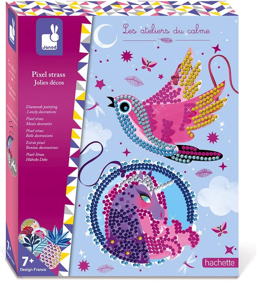 Description du produit Le pixel art strass : une grosse tendance ! Les Ateliers du Calme Collection Les Ateliers du Calme, ce coffret de création pour enfant permet de réaliser 3 décorations au rendu spectaculaire. Le paon mesure par exemple 8,6 x 6 cm. Ce kit contient 3 animaux en carton épais, 450 mini-strass, 1 stylet, 1 planche de 9 strass, 3 rubans et 1 carré de cire Peinture Numero Janod - From 4 Years Old - Creative Kit - Lamas Pompoms - Les Ateliers Jeux Enfant 7 Ans Fille Les mini strass : de petits bijoux brillants, très spectaculaires et attractifs Découvrez le kit créatifPixel Art Strass Jolies Décosde la collectionLes ateliers du calmede chezJanod, une activité créative pour découvrir le pixel art strass, pour les enfants à partir de 7 ans. Ce kit créatif permet de réaliser de 5 jolies décos en collant des mini-strass, en suivant des pas à pas et des modèles. Une activité créative qui apporte calme Une activité nouvelle sur le marché sous cette forme. Le pixel art strass : une grosse tendance. Contenu : 5 décos autocollantes à compléter avec 1500 mini-strass, 5 rubans., Boite cloche. Le Kit Créatif Strass et stickers C'est la Fête permet de réaliser, à l'aide des strass et des stickers à coller, de magnifiques tableaux.Dès 4 ans.