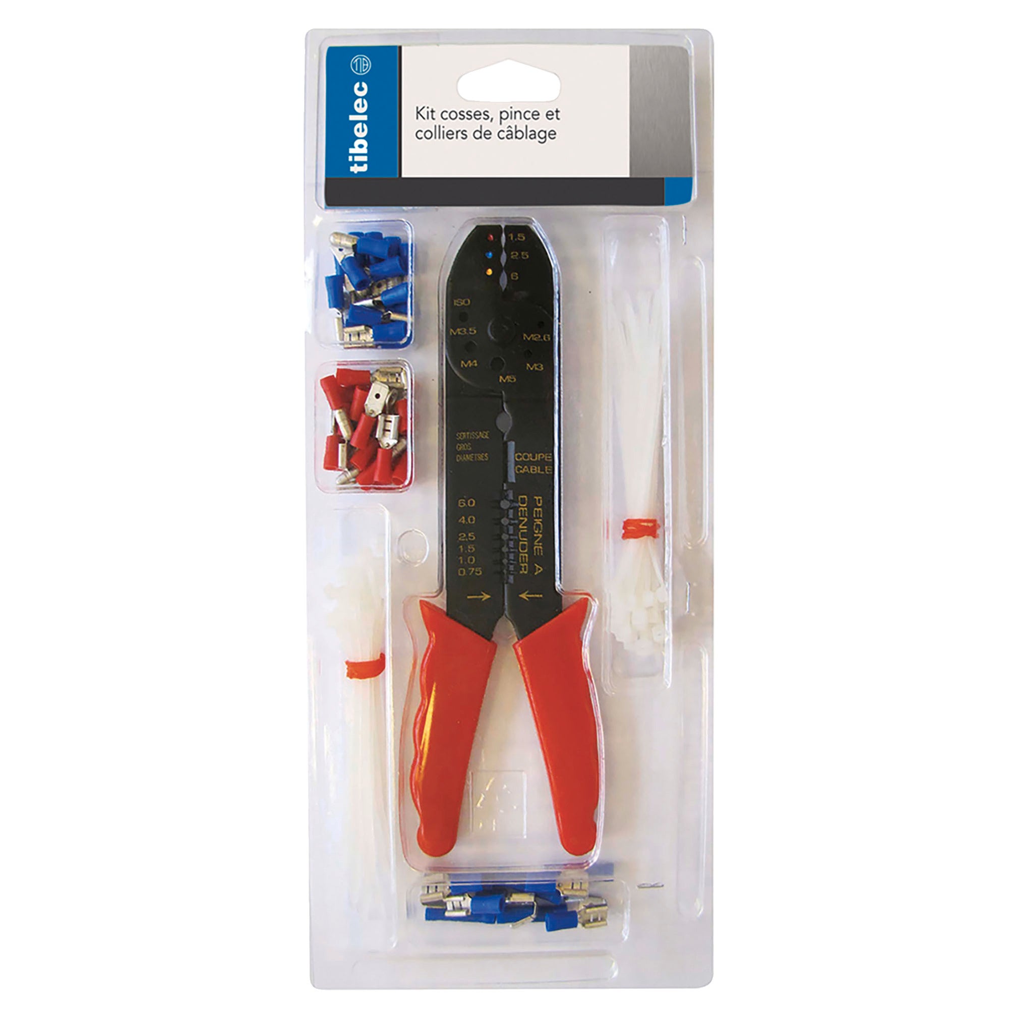 Coffret de 2 pinces à sertir et dénuder + assortiment de Pince Dinosaur à couper, dénuder le câble de 0,5 à 6 mm², dénudage automatique : l.25 mm maxi. Kit 2 pinces assortiment de cosses et ruban adhésif. ×. ×. photo_principale_964330 ... PLV 100% personnalisables. selon vos besoins. Éclairage. Accessoires... Assortiment de 100 cosses : cosses rouges (0,25-1,5mm) et bleues (1-2,5mm) Mannesmann M10997, Lot de 4 Pinces Multicolore à 23,02€ chez Amazon... Cosses Electriques Isolés Kit De 100 Pièces Normes Respectées : En Kit très complet : 100 cosses + 2 pinces + ruban adhésif Pince à sertir les cosses (1,5 à 6mm), à mesurer le câble (2,6 à 5mm), couper et dénuder le câble (0,75 à 6mm)
