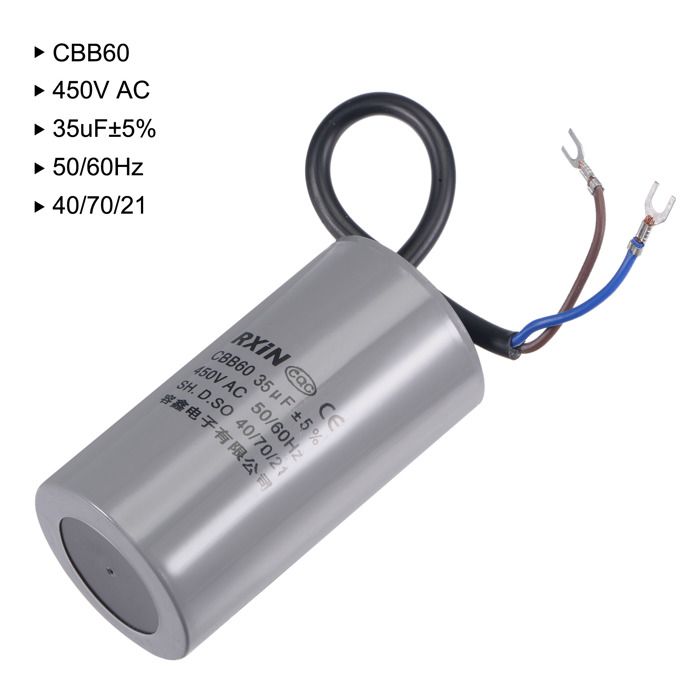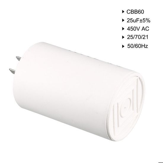 Condensateur Démarrage Condensateur 25uf 450v Sourcing Map CBB60 Marche AC 2 Fils 50/60Hz Cylindre 98x45mm Avec M8 Fixation Goujon Pour Air Compresseur Eau Pompe Moteur Condensateur 20uf Condensateur 10uf Le condensateur CBB60 est amplement employé pour les compresseurs d'air, les pompes à eau, les nettoyeurs haute pression, les climatiseurs, les machines à laver, les moteurs, les générateurs, le HVAC, les ventilateurs, les perceuses, les séparateurs, les scies, les meuleuses, etc. Si le condensateur de votre moteur et de votre compresseur d'air est grillé ou faible, vous devez le remplacer par un nouveau. Ce condensateur de fonctionnement CBB60 a des caractéristiques de petit volume, poids léger, faible perte, choc anti-surtension, excellentes performances électriques et longue durée de vie. Ce condensateur n'a pas de pôle positif et négatif, il peut être câblé à volonté Chez , vous trouverez une large sélection de condensateurs de qualité pour compresseurs, provenant de marques réputées. Assurez-vous de choisir le condensateur approprié pour garantir un fonctionnement optimal de votre compresseur [Application] - Le condensateur CBB60 est amplement employé pour les compresseurs d'air, les pompes à eau, les nettoyeurs haute pression, les climatiseurs, les machines à laver, les moteurs, les générateurs, le HVAC, les ventilateurs, les perceuses, les diviseurs, les scies, les meuleuses, etc. Condensateur de démarrage Condensateur moteur, CBB60 Insérer un [Note] - Ce condensateur n'a pas de pôles positif et négatif, il peut être câblé à volonté. [Caractéristique] - Ce condensateur de fonctionnement CBB60 présente des caractéristiques de petit volume, de poids léger, de faible perte, de choc anti-surtension, d'excellentes performances électriques et de longue durée de vie. [Spécifications] - Capacité nominale: 25 uF; Tolérance: ±5%; Tension nominale: 450V AC; Dimension du corps: 98 x 45mm/3,9 x 1,8 pouces(L*D); Fréquence nominale: 50/60 Hz; Catégorie climatique: 40/70/21 Caractéristiques: - Capacitance Capacity: 25uf - Certification: CE - Error: ±5% - Feature 1: long service life - Feature 2: light weight - Feature 3: High accuracy - Frequency: 50/60Hz - Item Type: Capacitor - Nom de: VBESTLIFE - Numéro de Modèle: 25uF Capacitor - Origine: CN (Origine) - Type: 25/70/-20 - Type de Moteur: Moteur AC - Voltage: 450V AC Remarque:Ce condensateur n'a pas de pôle positif et négatif, il peut être câblé à volonté.