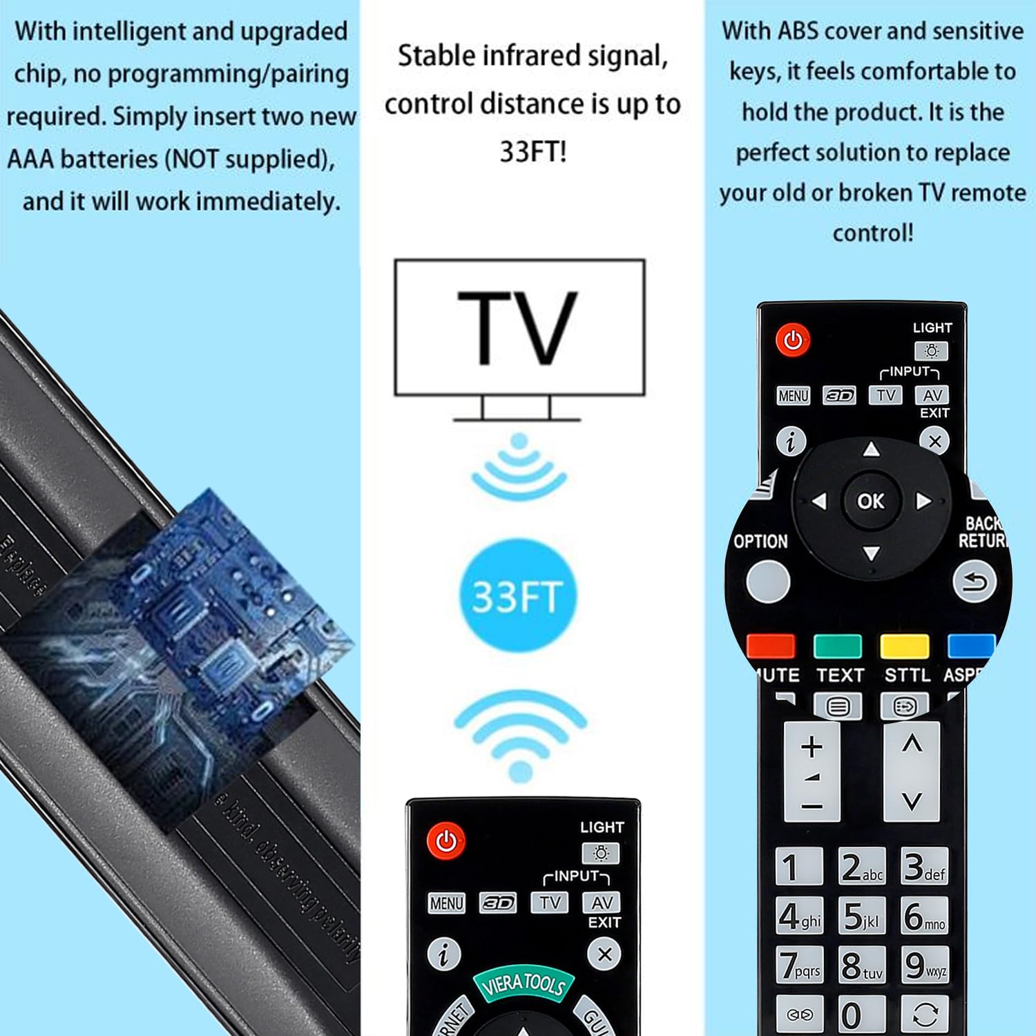 TX-P65VT50T TX-L47ET50B TX-P42GT50Y TX-L42DT50B TX-L47ET50E TX-L47WT50E TX-LR47DT50 TX-P42ST50E TX-P42ST50Y TX-P50ST50B TX-P50STW50 TX-P50VT50E TX-L47ET50Y TX-L47WT50B TX-L55DT50E TX-L55WT50B TX-L55WT50T TX-LR42DT50 TX-LR47WT50 TX-P42ST50J TX-P42STW50 TX-P50GT50E TX-P50ST50E TX-P50ST50Y TX-P50VT50Y TX-P55ST50E TX-P55ST50Y TX-P55VT50Y TX-P65ST50E TX-P65VT50Y TX-PR50ST50 TX-PR55VT50 TX-L42DT50E ALLIITY N2QAYB001115 Télécoande Replacer pour Panasonic Viera TV TX... Télécommande PANASONIC N2QAYB000715 TX-L42ET50B TX-P55VT50E TX-P55VT50T TX-P65STW50 TX-P65VT50E TX-L47DT50E TX-L47DT50B TX-L47DT50Y TX-L47ETW50 TX-L47WT50Y TX-L55DT50B TX-L55WT50Y TX-P50GT50B TX-P50GT50J TX-P50ST50J TX-P50VT50T TX-P55ST50B TX-P55ST50J TX-P55STW50 TX-L47WT50T TX-P42GT50B TX-P42ST50B TX-P50GT50Y Telecommande Panasonic Tv ALLIITY N2QAYB000780 Télécoande Replacer Pour Panasonic HDD Telecommande Pour Panasonic Rentrez la désignation/le modèle de l'appareil, dont vous recherchez la télécommande, comme par exemple le nom du téléviseur. Voir la rubrique: pièces détachée adaptée à votre appareil Certains modèles compatibles: TX-P65VT50T TX-L47ET50B TX-P42GT50Y TX-L42DT50B TX-L47ET50E TX-L47WT50E TX-LR47DT50 TX-P42ST50E TX-P42ST50Y TX-P50ST50B TX-P50STW50 TX-P50VT50E TX-L47ET50Y TX-L47WT50B TX-L55DT50E TX-L55WT50B TX-L55WT50T TX-LR42DT50 TX-LR47WT50 TX-P42ST50J TX-P42STW50 TX-P50GT50E TX-P50ST50E TX-P50ST50Y TX-P50VT50Y TX-P55ST50E TX-P55ST50Y TX-P55VT50Y TX-P65ST50E TX-P65VT50Y TX-PR50ST50 TX-PR55VT50 TX-L42DT50E TX-L42ET50B TX-P55VT50E TX-P55VT50T TX-P65STW50 TX-P65VT50E TX-L47DT50E TX-L47DT50B TX-L47DT50Y TX-L47ETW50 TX-L47WT50Y TX-L55DT50B TX-L55WT50Y TX-P50GT50B TX-P50GT50J TX-P50ST50J TX-P50VT50T TX-P55ST50B TX-P55ST50J TX-P55STW50 TX-L47WT50T TX-P42GT50B TX-P42ST50B TX-P50GT50Y TX-P50VT50B TX-P50VT50J TX-P55VT50B TX-P55VT50J TX-P65ST50Y TX-PR55ST50 TX-P65VT50B TX-P65VT50J TX-PR42ST50 TX-PR65VT50 TX-PR42GT50 TX-PR50GT50 TX-PR50VT50 TX-L42ET50Y TX-L42WT50B TX-L42WT50T TX-P65ST50B TX-P65ST50J TX-L55DT50Y TX-L55WT50E TX-LR55WT50 TX-P42GT50E TX-L42DT50Y TX-L42ET50E TX-L42ETW50 TX-L42WT50E TX-P42GT50J Aucune programmation n'est requise - insérez simplement les piles alcalines, cela fonctionne immédiatement pour les modèles ci-dessous: