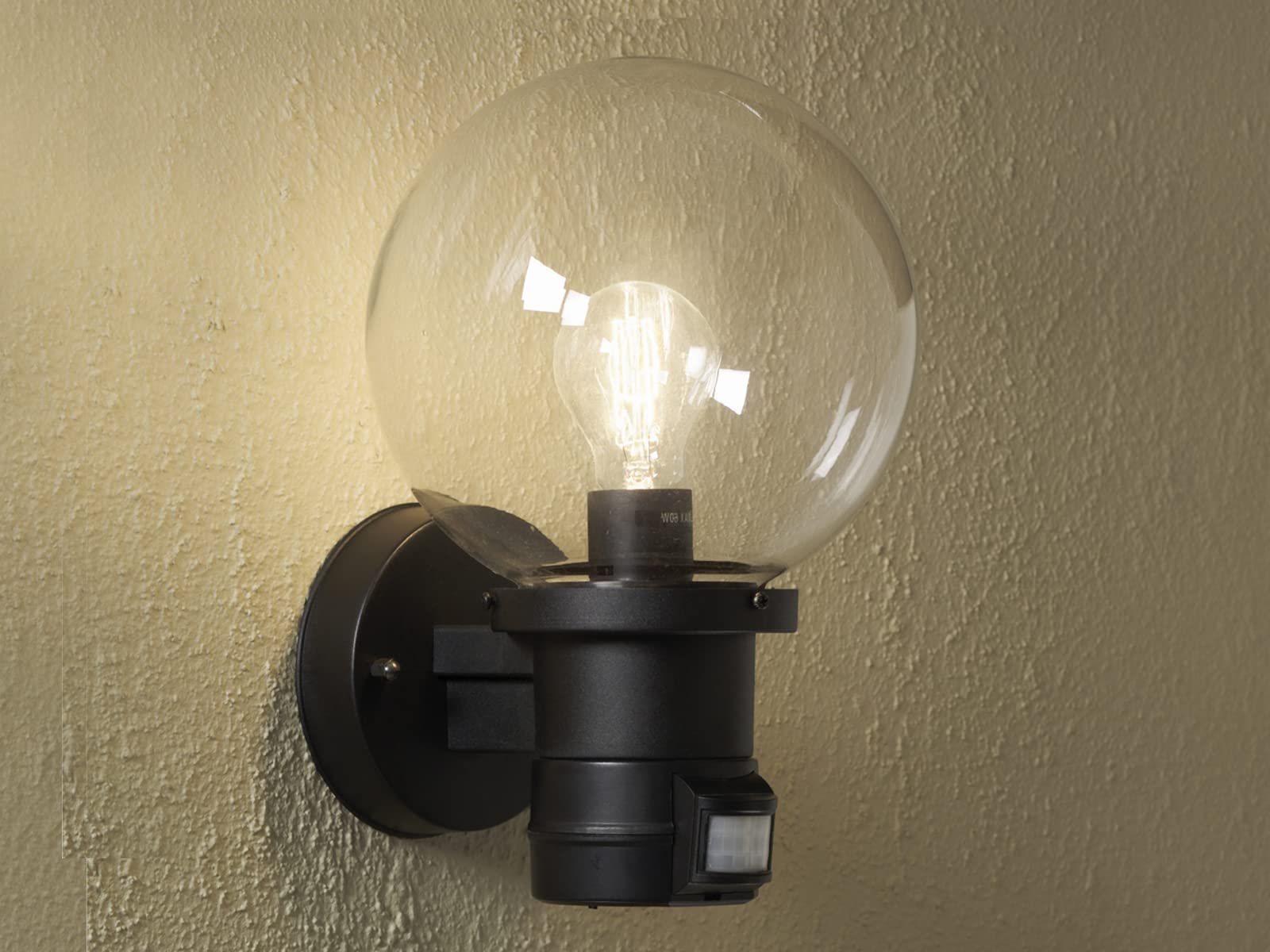 La lampe extérieure noire est idéale comme lampe de terrasse, éclairage d'abri de voiture, éclairage extérieur, comme éclairage de balcon ou de porte d'entrée. La lampe extérieure avec détecteur de mouvement est protégée contre les projections d'eau IP44., Avec 1 ampoule LED à filament E27 de 4 W, 470 lumens, blanc chaud. Matériau : plastique noir mat, verre transparent Avec 1 ampoule LED à filament E27 - 4 W - 470 lumens - Blanc chaud L'applique murale d'extérieur moderne de la marque Konstsmide offre les meilleures conditions pour un bon éclairage de façade ou de terrasse grâce à sa grande boule en verre. Détecteur de mouvement : oui - détection 140° / portée 3 m Temps d'éclairage en résonance : de 5 secondes à 10 minutes., Tension : 230 V. Nos luminaires sont conçus pour résister aux intempéries tout en ajoutant une touche d'élégance à votre espace extérieur. Explorez notre gamme dès aujourd'hui... Le détecteur de mouvement a une portée de 3 mètres avec un angle de détection de 140°. Protection : IP44 - Classe de protection : 2 Poids : 1,104 kg Couleur de la lumière : blanc chaud (2700 K). Dimensions (l x p x h) : environ : 20 x 27 x 31 cm - Diamètre de la boule en verre : 20 cm - Indice de protection IP44 Applique murale à LED en forme de boule de verre - Intensité variable - Noir - Style industriel - Moderne - Vintage - Créatif - Globe en verre - E27 - Pour Luminaire Exterieur Appliques Murales D'extérieur Avec Capteur Et Détecteur De Lampe Exterieur Detecteur De Mouvement Matériau : verre, plastique Couleur : noir mat - transparent.