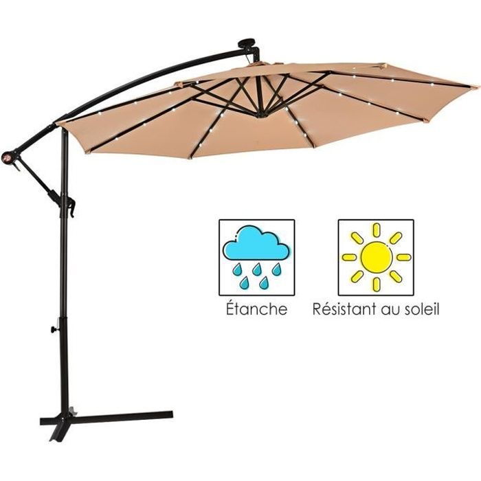 Diamètre de 3,4 m : assez large pour ombrager votre table ronde, carrée ou rectangulaire de 152,4 cm avec 4 à 6 chaises. Parasol déporté avec LED Sun 4 Luxe 3 x 4 m Profitez de vos soirées d'été avec le parasol SUN 4 LUXE. Avec son éclairage LED, notre parasol vous permet de prolonger vos diner dans une ambiance agréable. 100% autonome, les lampes LED sont alimentées par une cellule solaire. Inclinable et rotatif à 360°, vous pouvez très facilement l'ajuster pour vous protéger du soleil tout au... Facile à utiliser : le système de manivelle ouvre et ferme le parasol avec facilité. Parasol 3m Parasol Déporté 3M Avec Base 96 LEDs - COSTWAY - Protection Solaire Parasol Bleu Nous attachons une grande importance à chaque client, et nous promettons de faire de notre mieux pour vous offrir une solution satisfaisante. Parasol d'extérieur 3m pour de grandes zones d'ombre96 lampes LED solaires créent une ambiance magique pour les soiréesPanneau solaire puissant fournit une électricité suffisanteParasol inclinable à 35° pour obtenir le meilleur pare-soleilParasol de plage en tissu polyester, résistant à la décoloration et aux déchiruresStructure en... Parasol de Jardin 3M, Parasol Inclinable 8 Baleines, Lumineux Solaire 24 LED, Manivelle, Anti-UV, Grand Parasol pour Plage, Balcon, Patio, Marron | Leroy Merlin Excellent service client : si vous n'êtes pas satisfait, veuillez nous contacter. Tige en fer robuste et baleines en acier : le mât de parasol en fer résistant à la rouille de 3,5 cm de diamètre et les 8 baleines en acier résistant à la rouille offrent un soutien de résistance supérieure pour une meilleure résistance au vent.