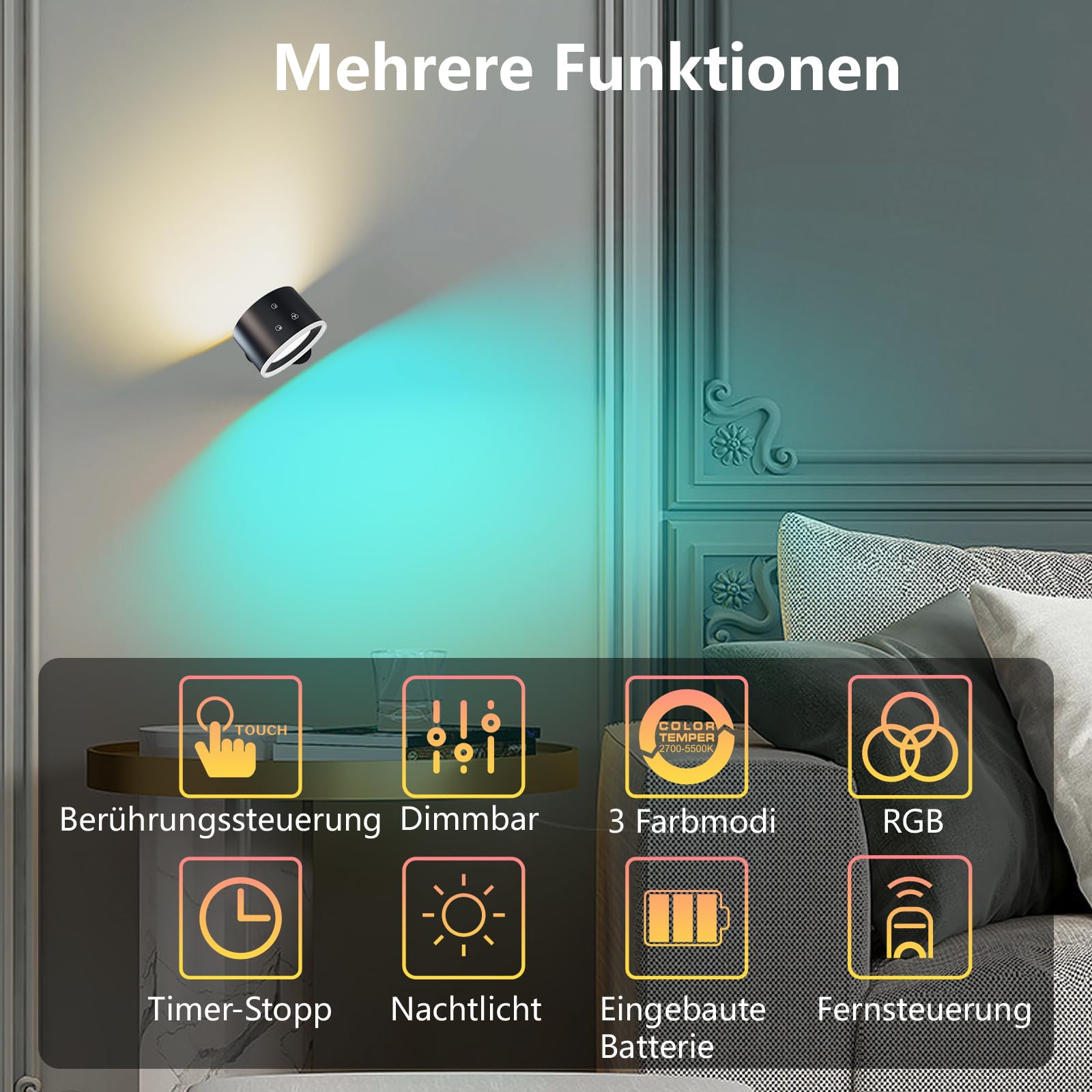 L'applique murale LED a 3 modes de couleur et 5 niveaux de luminosité pour une variété d'options d'éclairage, vous pouvez choisir entre 3 températures de couleur (blanc chaud 3000 K, blanc naturel 4500 K, blanc froid 6500 K). Lorsque la lumière est éteinte, elle enregistre la dernière couleur et luminosité lors de la prochaine mise sous tension. 2PCS Applique Murale Batterie Rechargeable USB avec Détecteur de Applique murale à éclairage vertical et horizontal : Applique murale sans fil double face : un côté avec 3 températures de couleur : lumière blanche, lumière naturelle, lumière chaude, et l'autre avec 9 couleurs RVB. Les deux disposent d'une luminosité réglable et d'une minuterie. Idéale pour la lecture, la chambre, le placard et le salon. Grâce à la télécommande, vous pouvez... 3 réglages de minuterie et fonction mémoire : peut être réglé sur un compte à rebours de 0,5 h-1 h-2 h pour éteindre automatiquement la lumière. Applique Murale Led Interieur Applique Murale Magnétique Moderne Avec Télécommande, Veilleuse Tactile Rotative à 360°, Changement De Couleur RVB, Applique à Intensité Variable Appliques Murales Interieures L'autre est le mode de lumière de couleur avec 9 couleurs RVB et 5 niveaux de luminosité parmi lesquels vous pouvez choisir, de sorte que vous pouvez créer une ambiance selon vos goûts. Cette applique murale polyvalente sert non seulement de solution d'éclairage, mais aussi de lumière de secours, de lampe de charge amovible et d'une œuvre d'art exquise. Lumière d'ambiance RVB : avec le mode d'ambiance de surface RVB, vous pouvez choisir parmi 9 couleurs de lumière différentes pour créer l'atmosphère lumineuse souhaitée. Batterie 7500 mAh pour une puissance et une longévité exceptionnelles]Cette lampe murale LED rechargeable a été conçue pour l'intérieur et est équipée...