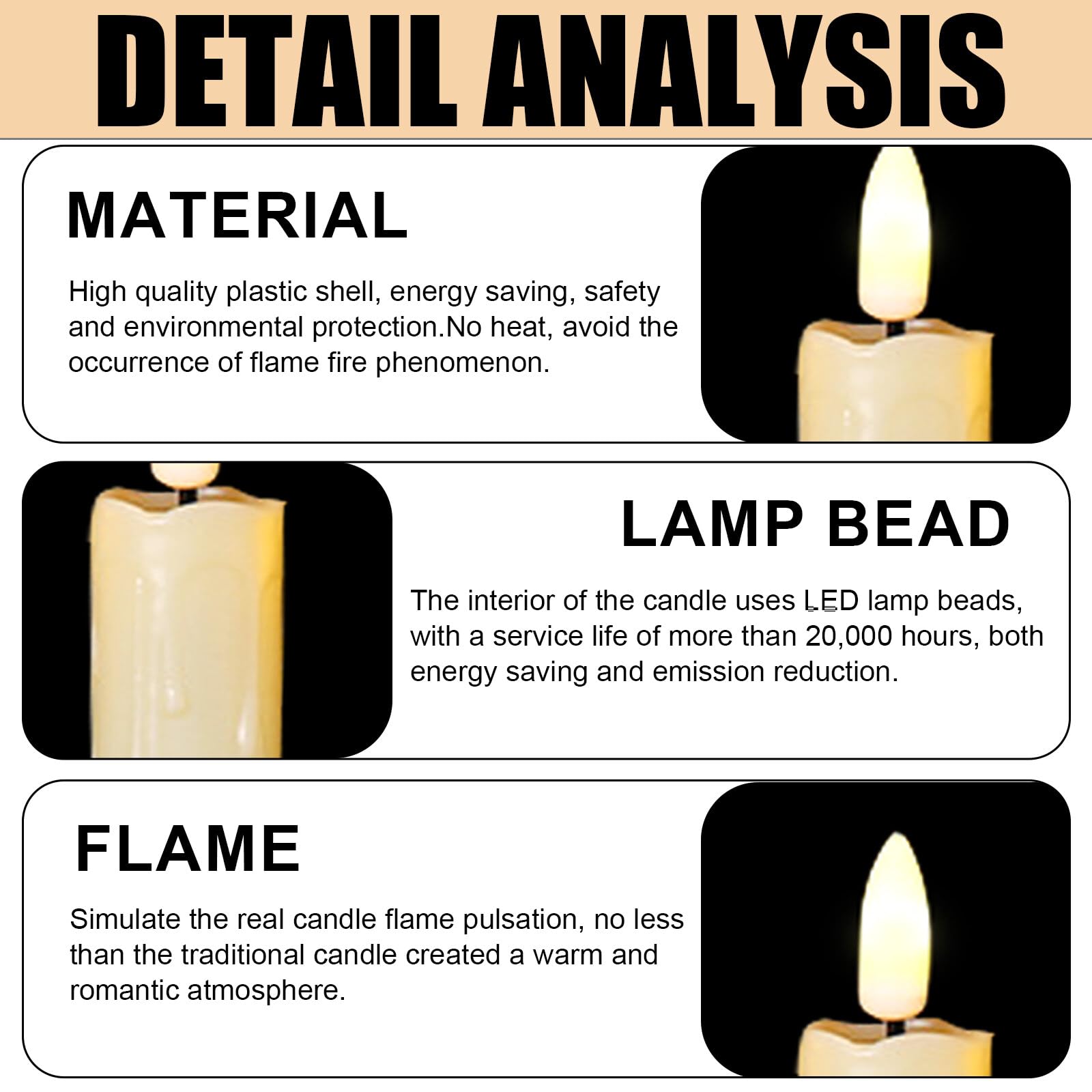 Absolument sûr : les bougies LED sans flamme sont absolument liées au risque d'incendie, de cire gênante ou de fumée. C'est une décoration parfaite pour les mariages, Noël, Thanksgiving ou Pâques. Bon choix pour la décoration intérieure et extérieure] Créez une atmosphère romantique, paisible et chaleureuse en quelques étapes simples, cette bougie LED convient aux décorations extérieures telles que Noël, Halloween, la Saint-Valentin, les mariages, les fêtes, etc., et peut également être utilisée pour les décorations... 【Scintillement 3D réaliste】 Le design d'une flamme vacillante 3D avec une lumière jaune chaud vacillante rend la bougie plus réaliste. Les bougies LED en plastique et en cire créent une authentique lumière vacillante pour une ambiance belle et chaleureuse dans n'importe quelle pièce., Fonction minuteur. Décoration parfaite : les bougies LED à piles sont parfaites pour les rebords de fenêtre, les cheminées et les tables à manger. Caractéristiques du produit : Couleur : ivoire. Toutes les bougies diffusent une lumière chaude vacillante dans la pièce grâce aux modes de bougie. Contenu de l'emballage : 6 bougies à tige LED (taille : 2,2 cm de diamètre x 25 cm de hauteur). Ensemble complet : le paquet comprend 6 bougies coniques noires sans flamme (17,5 x 1,8 cm), une minuterie avec 10 boutons, et un manuel simple (français... Il donne à la pièce une sensation de chaleur et de sécurité que les vraies bougies ne peuvent pas offrir. Chandelier Noel Lot De 6 Bougies LED Rechargeables Avec Fonction Minuterie Et Cierge Led Vous pouvez avoir des soirées parfaites dans votre ambiance, en particulier pour la famille avec des enfants/animaux domestiques, la sécurité est primordiale. Matériau : polypropylène. Créer une atmosphère romantique ou chaleureuse peut devenir la meilleure décoration. Les bougies LED sans flamme sont absolument exposées au risque d'incendie, de cire gênante ou de fumée. Lot de 6 bougies LED avec télécommande