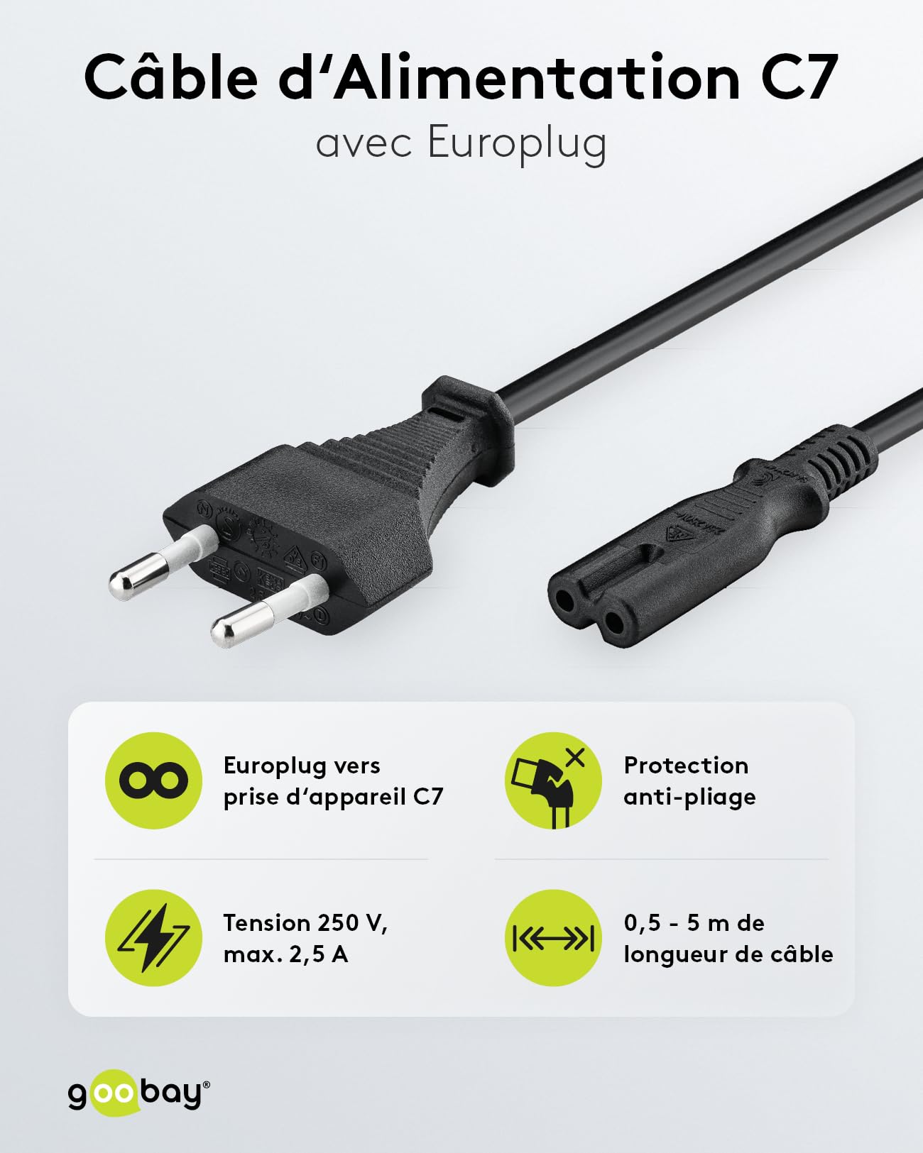 Rallonge UE ; 2 m Noir - Fiche Euro (type C CEE 7/16) Prise Euro (type C CEE 7/16) Euro mâle à euro femelle pour TV, PC, moniteur, vidéoprojecteur, appareils ménagers, lampes, luminaires, haut-parleurs, alexa, guirlandes lumineuses, radios, téléviseurs et ordinateurs La vente et l'utilisation de la rallonge de prise sont interdites au Danemark et en Suisse Equipé d'une fiche Euro plate de type C (CEE 7/16) et d'une prise Euro de type C (CEE 7/16), il est idéal pour diverses applications domestiques ou Bureau. Le noir rallonge électrique d'une longueur de 2 mètres permet une alimentation électrique flexible sans restrictions Connexion inclinée : Câble avec connecteur coude à chaud · Longueur : 2 mètres · Couleur : Noir · Prise de sécurité hybride : Type E/F, CEE 7/7, 90° · Connecteur... Prise Male 220v DeleyCON 10m Rallonge Câble Euro Électrique Type C Fiche Euro Prise Vers Type-C Euro Jack TV PC Rallonge Electrique 1m Adaptateur Rallonge Câble Alimentation Dell 0U9399 U9399 Noir 250V Power Cord