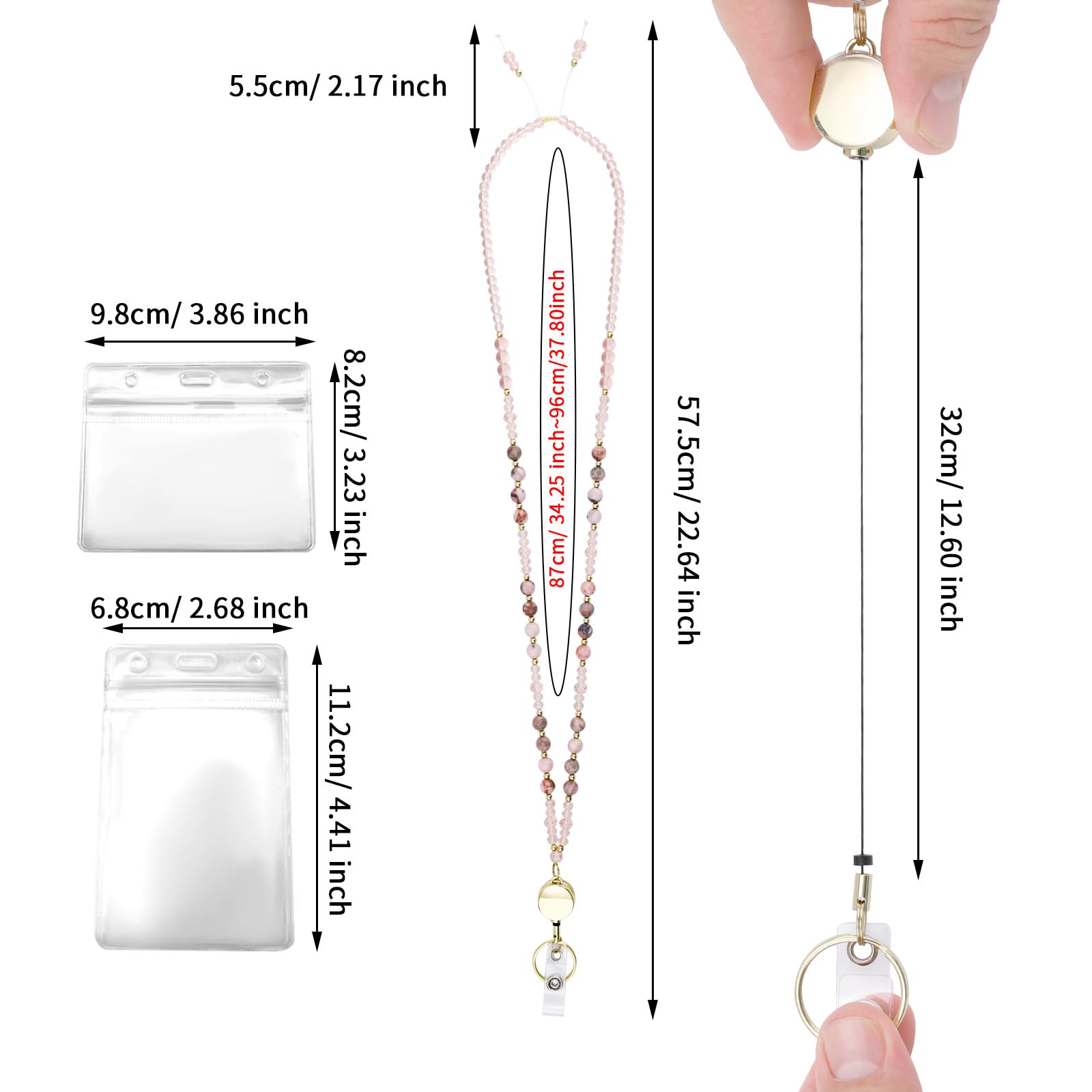 Cordon rétractable pour badges d'identité et clés avec enrouleurs de badges, cordon en perles de pierre naturelle pour femmes et enseignants, joli cordon détachable pour croisière, bureau et voyage Élégant et fonctionnel : ce cordon est doté d'un enrouleur de badge rétractable en strass étincelant, ajoutant une touche d'élégance à votre routine quotidienne. Il est parfait pour transporter votre carte d'identité, vos clés ou d'autres petits objets essentiels tout en faisant une déclaration de mode.Qualité supérieure et sécurité : fabriqué avec une corde en nylon de haute... Hoyuwak Cordon De Perles Rétractable Pour Femme, Joli Cordon De Professeur Avec Porte-carte D'identité, Collier De Perles En Pierre Naturelle Pour Clés, Porte-clés, Cartes (marron Porte Badge Tour De Cou Avec 2 Pcs Porte-Cartes, Porte Badge Enrouleur