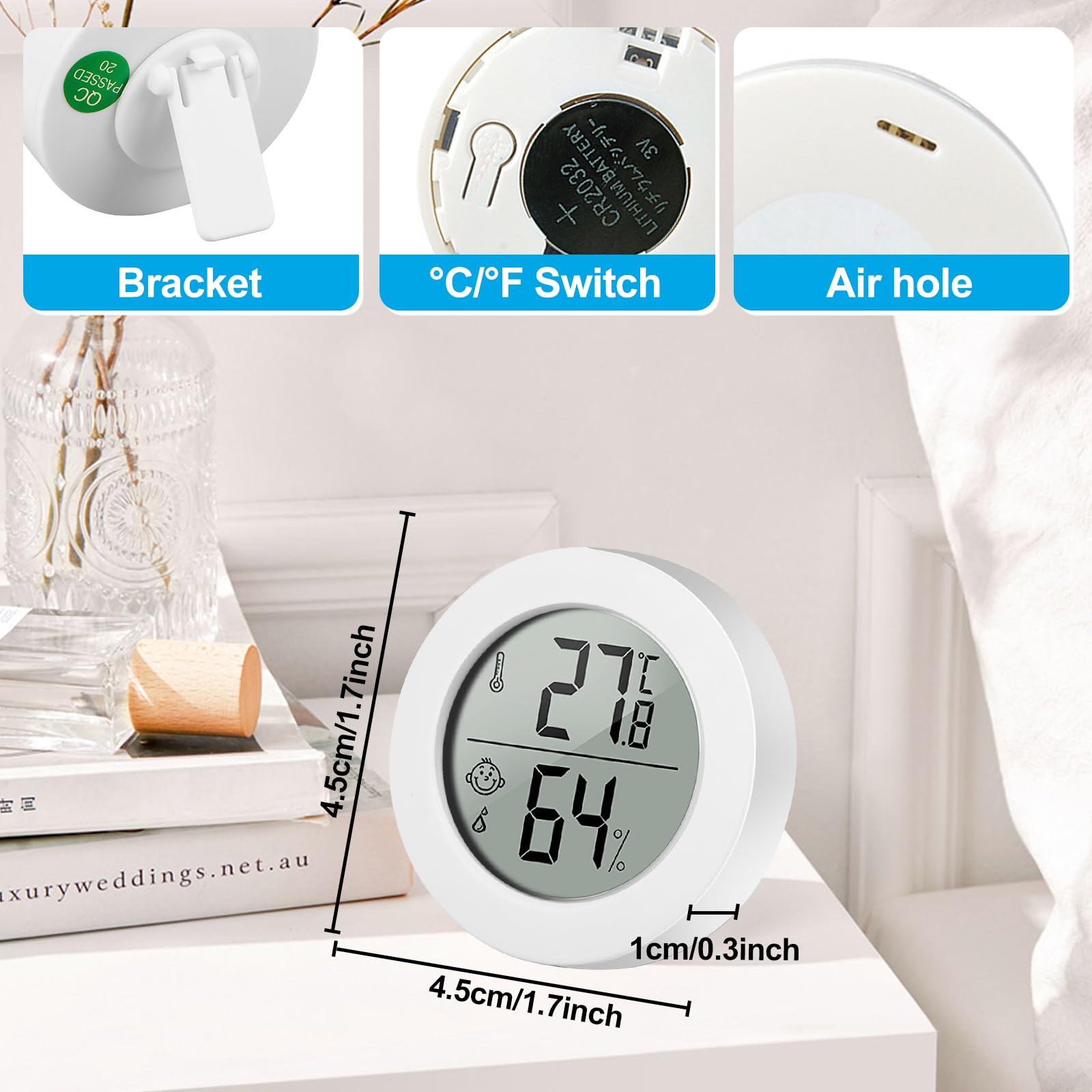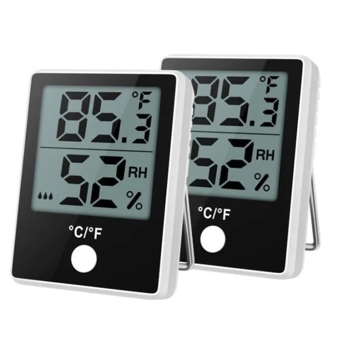 Ce thermomètre et hygromètre est un outil essentiel pour maintenir un espace de vie confortable et sain. L'écran facile à lire utilise des icônes joyeuses, neutres et tristes pour indiquer que l'air est sec, confortable ou humide. Parfait pour une utilisation dans les terrariums de reptiles, la chambre, le bureau, le salon, les incubateurs, les couveuses et les bars de cigares. Facile à lire et à utiliser Celsius pour correspondre à vos préférences, offrant une surveillance intuitive et personnalisable de la température. Il est équipé d'un grand écran LCD clair, d'un bouton Celsius/Fahrenheit et d'un indicateur de confort intuitif avec icônes de visage. Capteurs de haute précision pour des lectures précises : ce thermomètre et hygromètre d'intérieur mesure une plage de température de -50 °C à 70 °C et l'humidité mesure 10 à 99 % HR, assurant une surveillance précise pour une meilleure qualité de l'air et des ajustements rapides dans n'importe quel environnement. Caractéristiques : le thermomètre et hygromètre est un outil compact mais très efficace pour surveiller les conditions intérieures. Options de placement polyvalentes : qu'il soit placé sur une table ou monté sur les murs avec les autocollants inclus, ce thermomètre compact s'adapte aux chambres, chambres de bébé, serres, caves à vin, etc. Nettoyez les surfaces de montage avant d'appliquer les autocollants pour une adhérence optimale. Capteur de haute précision avancé : intégré avec capteur précis et sensible, le thermo-hygromètre met à jour la température et l'humidité toutes les 10... Alimenté par une batterie longue durée (incluse), l'appareil offre jusqu'à des mois d'utilisation, assurant fiabilité et entretien réduit. Lot De 2 Mini Hygromètres Numériques Avec écran LCD Fahrenheit (℉) Ou Conseils d'utilisation : laissez le thermomètre s'adapter à son nouvel environnement pendant 10 à 20 minutes lors de la première utilisation pour garantir un étalonnage précis. L'unité est actualisée toutes les 10 secondes pour des mises à jour en temps réel. Indicateur de confort avec icônes de visage : restez informé de vos conditions intérieures en un coup d'œil. Polyvalent et pratique : compact et léger, cet appareil s'adapte parfaitement à n'importe quel environnement. Termometro Digitale Lot De 6 Thermomètres Hygromètres Mini