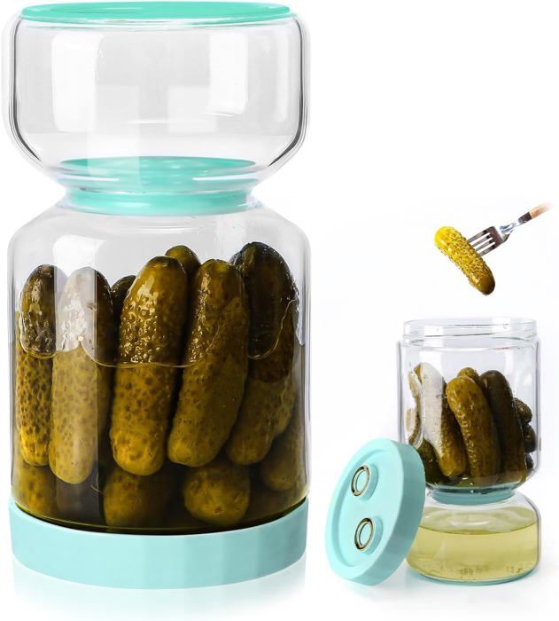 KIKINIKO Bocal à cornichons de 680,4 g avec passoire, support pour cornichons, récipient de Décoration de la réserve - les bocaux sont vendus avec des couvercles colorés, sur lesquels se trouvent de délicieux légumes comme le chou-fleur, le poivron, la courgette, les tomates. Avec un couvercle protecteur, hermétique et étanche, il empêche efficacement les odeurs. Caractéristiques : 1., Le lot de pots à cornichons comprend un filtre de levage amovible et un support, il suffit de soulever le panier pour égoutter, de soulever les cornichons facilement et de garder les mains au sec. Design innovant pot à cornichons comprenant une passoire amovible avec support et un couvercle hermétique et étanche. Grâce à son design modulaire et 2 en 1... Pour les conserves fermentées et marinées – les bocaux sont parfaits pour les conserves de légumes pour l'hiver ainsi que pour les produits séchés.Décoration de la réserve - les bocaux sont vendus avec des couvercles colorés, sur lesquels se trouvent de délicieux légumes comme le chou-fleur, le poivron, la courgette, les tomates.Couvercles hermétiques – grâce aux couvercles ajustés à 6 crochets de type twist off, vous pouvez être sûr que les conserves sont bien fermées et que rien ne se renversera du bocal.Couvercles de type 'Clik' – grâce à eux, vous avez la certitude que les conserves sont bien pasteurisées et que le contenu ne se gâtera pas pendant toute la durée de conservation.Nettoyage facile – vous pouvez laver les bocaux en toute sécurité au lave-vaisselle, mais grâce à la large ouverture 82 mm, vous pouvez également les laver facilement à la main.Un ensemble de 6 bocaux d'une capacité de 425 ml avec des couvercles décoratifs aux motifs de légumes twist-off, d'un diamètre de , ( ['conserves de légumes', ' courgettes marinées', ' chou-fleur fermenté', ' purée de tomates', ' bocaux avec couvercles', ' conserves maison', ' pour fermentation', ' conserves de tomates', ' poivrons fermentés', ' poivrons marinés Il bascule également facilement entre les aliments secs et humides, pas seulement les concombres marinés. Couvercles hermétiques – grâce aux couvercles ajustés à 6 crochets de type twist off, vous pouvez être sûr que les conserves sont bien fermées et que rien ne se renversera du bocal. Grâce à son design modulaire et 2 en 1, ce récipient alimentaire offre un stockage innovant et sans désordre et des fonctionnalités de filtrage sans effort. Parfait pour contenir des carottes, des pommes, des morceaux d'ananas ou d'autres fruits., 3., Le pot à cornichons est fabriqué en matériau de qualité alimentaire, qui n'est pas facile à déformer et à endommager. Pot A Cornichon Retournable Bocal à Cornichons Avec Passoire, Récipient à Cornichons 100 % Sans BPA Avec Passoire, Support De Cornichons, Seau De Cornichons En Fût D'olive, Jalapeno, Anti-fuite Et Couvercle Verrouillable, Pot à Bocal Cornichon Retournable En Verre La bouteille est transparente pour une identification facile des aliments. Design étanche : le bocal à olives et cornichons est livré avec des couvercles en silicone solides qui garantissent une fermeture hermétique pour éviter toute fuite ou déversement. Matériau de qualité alimentaire : les pots à cornichons en plastique transparent avec passoire sont fabriqués en polypropylène sans BPA et en silicone de haute qualité. Cadeau parfait : cadeau unique à offrir pour une pendaison de crémaillère ou une fête prénuptiale. Un excellent cadeau pour un chef débutant ou expérimenté dans votre vie Conçu pour une utilisation peu salissante, c'est également un excellent ajout au réfrigérateur de bureau pour garder la cuisine propre et professionnelle.