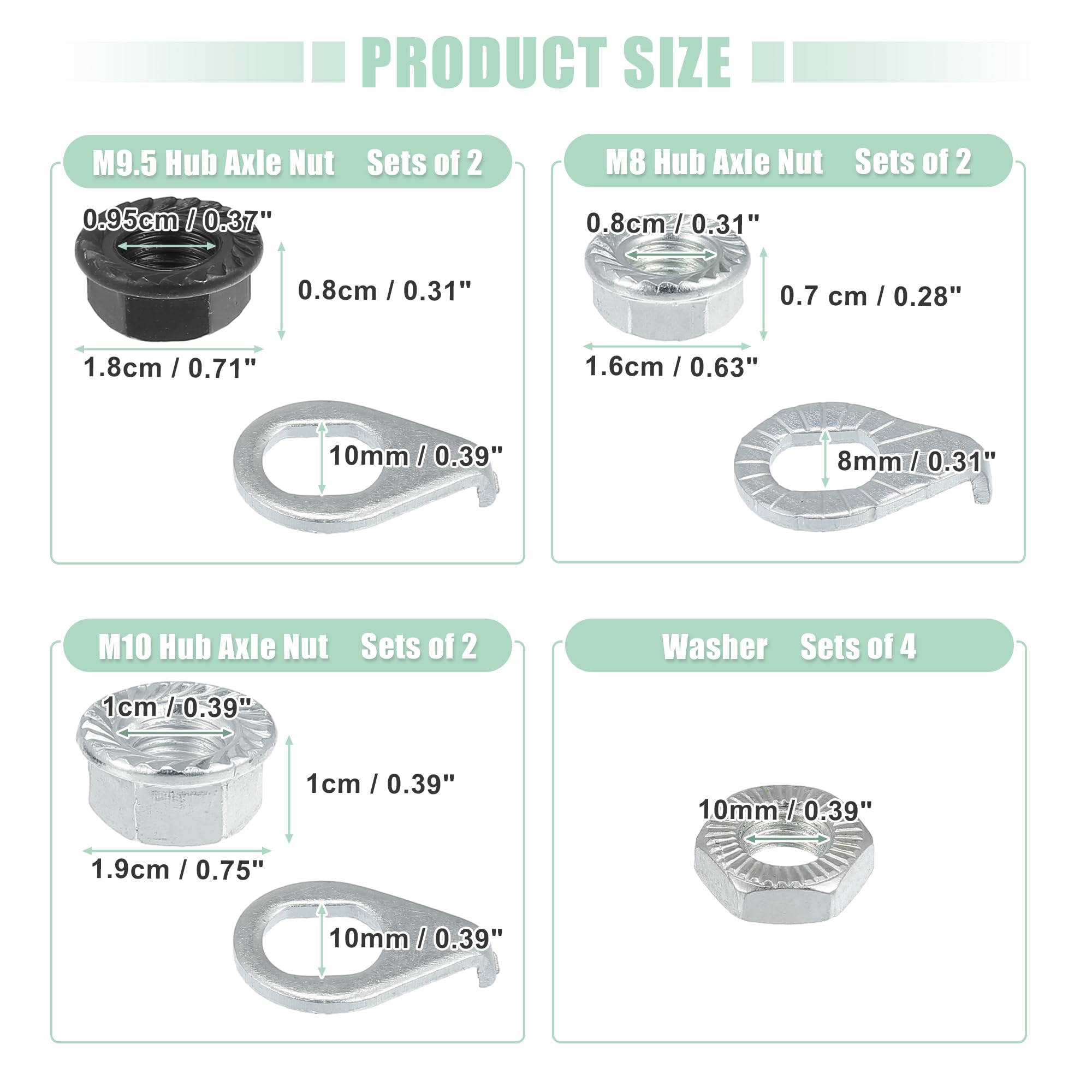 L'emballage comprend : vous recevrez 4 pcs écrous de vélo M8, 4 pcs écrous de vélo M9,5, 4 pcs écrous de vélo M10, 8 pcs rondelles de sécurité de vélo de 10 mm, 4 pcs rondelles de sécurité de vélo de 8 mm. Assortment d'écrous de sécurté pour lave-lnge de vélo moteur M8 M9 5... Les vélos pour enfants et les vélos pour femmes utilisent généralement des écrous M8 sur l'essieu avant et des écrous M10 sur l'essieu arrière. L'ensemble d'écrous et de rondelles de roue de vélo est bien poli afin qu'il soit lisse pendant l'utilisation. M8 M9 5 M10 Moyeu De Vélo écrous Moteur Lave-linge De Sécurité Pour Écrou de moyeu de roue de vélo X AUTOHAUX 1 Kit Vélo M8/M9.5 Applicable à: divers types de vélos et différents types de vélos, mais les différents types de vélos utilisent des écrous de spécifications différentes. Caractéristiques:Conçu avec soin pour favoriser un écoulement sans entrave, un montage aisé, et une durée de vie prolongée, l'ensemble d'écrous de roue et de rondelles est constitué d'un métal solide et exceptionnellement durable, difficile à briser ou à déformer. Spécification:Couleur: ton argent, noirMatériau: MétalÉcrou de vélo M8: OD: 1,6 cm / 0,63, ID: 0,8 cm / 0,31, Hauteur: 0,7 cm / 0,28Écrou de vélo M9., 5: OD: 1,8 cm / 0,71, ID: 0,95 cm / 0,37, Hauteur: 0,8 cm / 0,31Écrou de vélo M10: OD: 1,9 cm / 0,75, ID: 1 cm / 0,39, Hauteur: 1 cm / 0,39Rondelle de sécurité pour vélo: 10 mm / 0,39, 8 mm / 0,31Remarque:Veuillez mesurer la taille de votre toit de vélo soigneusement avant d'acheter. Convient pour: divers vélos et différents types de vélos, tels que les vélos de route, les ATV, les vélos pliants, les vélos à plat, les vélos pour enfants. Taille standard : tour de poitrine : (S) 33-35, (M)35-37, (L) 38-40, (XL) 100-100 cm. Tissu confortable : les hauts de maternité Glampunch sont fabriqués en 95... Les écrous de taille différente sont requis pour les diverses catégories de vélos. En raison de la mesure manuelle, il peut y avoir des erreurs dans taille et poids. Vous pouvez marquer les dimensions de l'arbre sur papier, puis mesurer la circonférence de l'arbre, ou utiliser des étriers pour mesurer le diamètre. Par exemple, les ATV utilisent généralement des écrous M10 pour leurs essieux avant et arrière. L'ensemble d'écrou de roue et de rondelle de vélo est bien poli, il est donc lisse lors de l'utilisation.