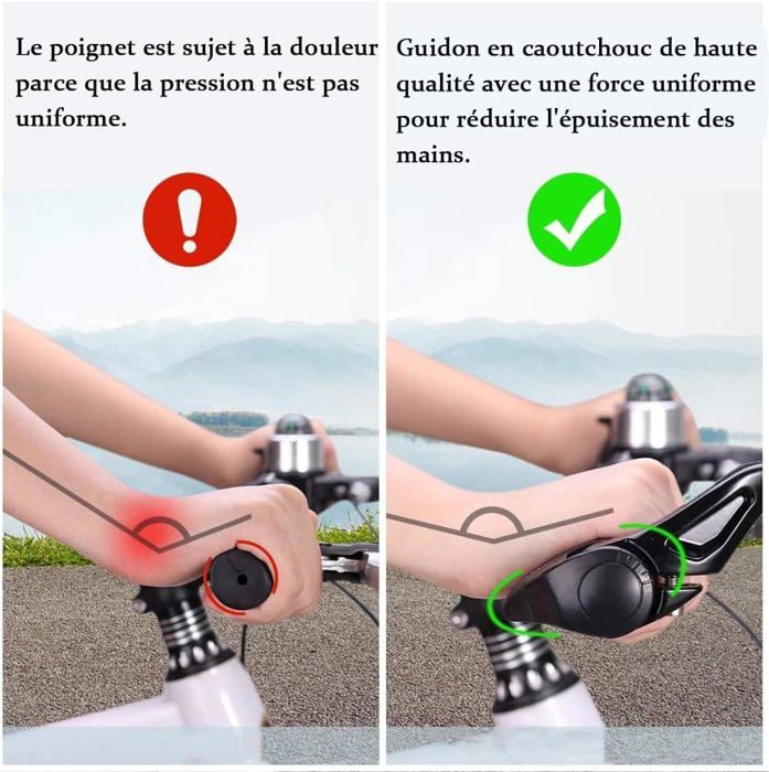 Design ergonomique pour plus de confort : avec un design ergonomique qui s'adapte aux courbes naturelles de vos mains, nos poignées de vélo offrent une prise en main confortable pendant les trajets. La zone de préhension élargie répartit la pression uniformément, réduisant la fatigue et l'inconfort sur les longs trajets. Dimensions du colis : 140 x 76 x 36 mm. Poignées ergonomiques en caoutchouc pour guidon de vélo, VTT, BMX, non ald, avec verrouillage bilatéral Matériau en caoutchouc de qualité supérieure : les poignées de guidon de vélo sont fabriquées en caoutchouc de haute qualité, assurant durabilité et résistance aux chocs. Caractéristiques : Couleur : noir/rouge/bleu/jaune/vert/bleu-vert (facultatif). En caoutchouc de qualité, elles sont ergonomiques pour épouser la forme de vos mains et absorber les chocs. Leur texture antidérapante assure une bonne prise... Diamètre intérieur : 22,2 mm., Longueur : 135 mm. Matériau : caoutchouc + alliage d'aluminium. Ajustement universel pour la plupart des vélos : avec un diamètre intérieur de 22,2 mm et une longueur de 135 mm, ils sont compatibles avec une large gamme de vélos, y compris les VTT, les vélos de route, les vélos pliants, et plus encore. Poids du colis : 155 g. La zone de préhension élargie répartit la pression uniformément, réduisant la fatigue et l'inconfort sur les longs trajets. Mécanisme de verrouillage sécurisé Hanzete Poignées De Guidon De Vélo Antidérapantes En Mécanisme de verrouillage sécurisé : les anneaux de verrouillage en alliage d'aluminium offrent un mécanisme de verrouillage sécurisé, empêchant tout mouvement indésirable ou rotation des poignées.