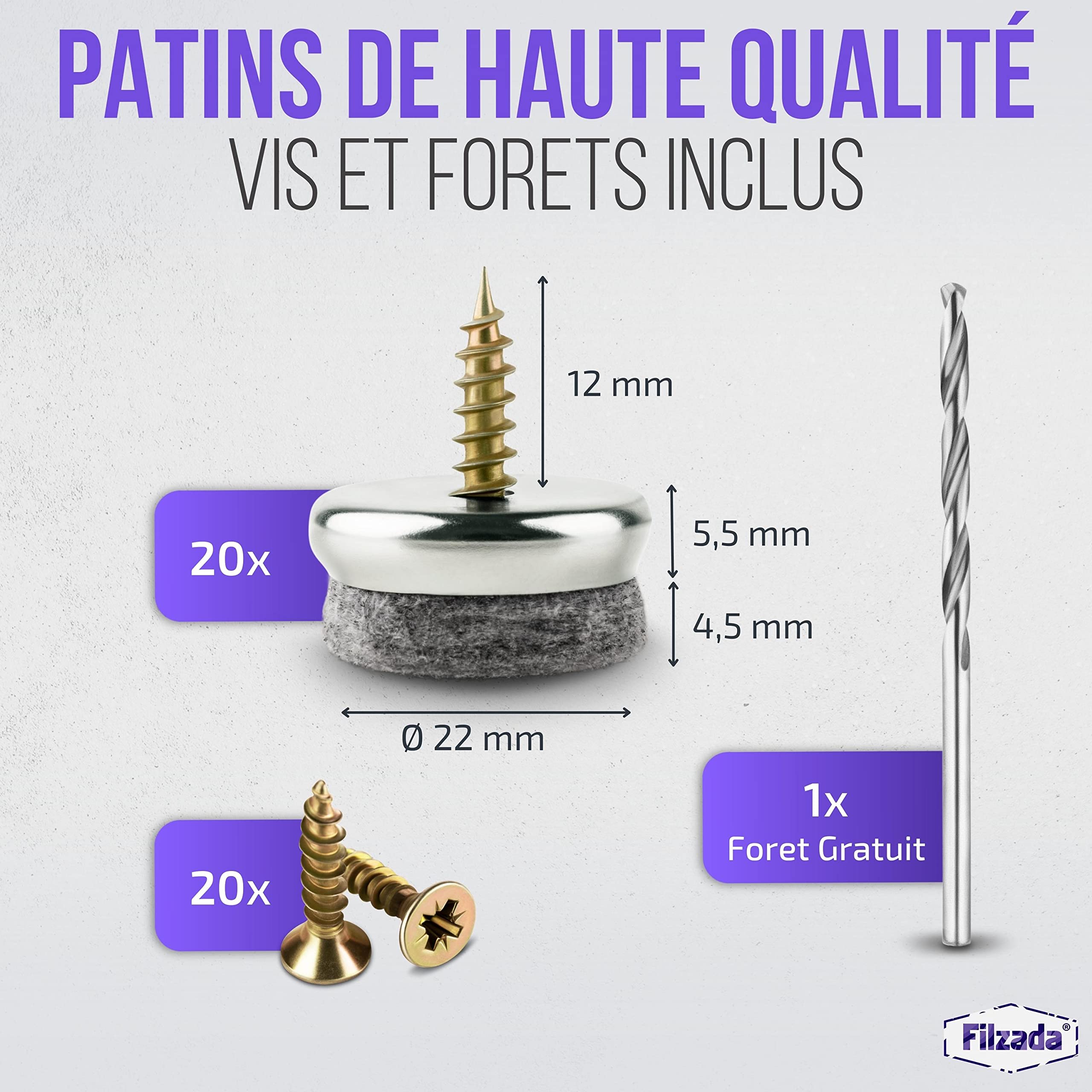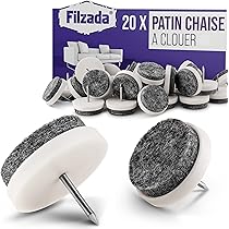NOUVELLE FABRICATION : Avec un feutre extra fort (5,5 mm d'épaisseur ! Pied De Meuble Filzada® 20 Patins à Vis En Feutre - 22 Mm - Professionnels Patin à Visser Extérieur POUR SOLS LISSES: Comme protection des sols / protection contre les rayures, convient pour le stratifié, le parquet, le carrelage, le marbre, le sol en vinyle, le PVC / linoléum, le liège, la pierre naturelle., Planches de bois Maintien stable : grâce à la vis, convient également aux sols riches en joints – Patins de meubles professionnels en PTFE pour montage sur la chaise/pied de... Lot de 20 patins en feutre avec vis 22 mm NOUVELLE FABRICATION : Avec un feutre extra fort (5,5 mm d'épaisseur ! Matériaux de haute qualité] Notre planeur de meubles est en téflon (PTFE), qui est solide, résistant à l'usure et au vieillissement. Non toxique et inoffensif, autolubrifiant, faible coefficient de frottement et pas de bruit lors du glissement. La surface est douce, de sorte que le sol ne sera pas endommagé même s'il glisse par gravité CARACTÉRISTIQUES DU PRODUIT: 20x patins en feutre avec vis - Ø 22 mm - Pour l'assortiment complet des patins en feutre Filzada, recherchez Patins en feutre Filzada ) et des fibres de feutre extrêmement denses de 3300 GSM (grammes par mètre carré), les patins pour meubles sont adaptés aux chaises, tables, fauteuils / canapés, tabourets de bar, etc.
