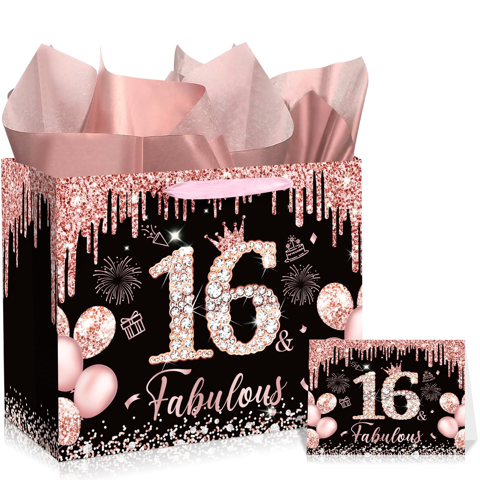 ROCKY&CHAO Sac cadeau noir or rose pour 16e anniversaire et fabuleux pour filles, sac cadeau pour 16e anniversaire avec carte en papier cadeau pour 16e anniversaire décorations de fête Fabriqué à partir de papier épais et durable, ce joli sac cadeau de 16 personnes transportera en toute sécurité des cadeaux pour son grand jour. 【Garantie de service】: nous nous engageons à garantir que votre expérience est fabuleuse. Remarque : Les mesures étant prises à la main, les tailles indiquées peuvent varier légèrement. Contenu : vous recevrez un sac cadeau de 33 cm, 3 rouleaux de papier cadeau mesurant 76,2 x 50,8 cm, une jolie carte d'anniversaire de 16 ans et une... Papier cadeau or rose : 69,8 x 50,8 cm. Parfait pour toutes les occasions : le sac cadeau d'anniversaire Happy Sweet 16th Birthday en or rose est conçu pour plus que de simples cadeaux d'anniversaire. Matériaux de haute qualité : fabriqué à partir de papier durable, ce sac cadeau or rose, ainsi que la carte d'anniversaire et le papier de soie inclus, garantissent que votre jolie présentation de seize cadeaux se démarquera. Carte d'anniversaire 16 ans et fabuleux : 11,9 x 17,8 cm. Le design convient pour 16 décorations pour les filles et les fêtes d'anniversaire de 16 ans, ce qui en fait une belle partie de la décoration de l'événement. Les couleurs peuvent paraître légèrement différentes selon les écrans. Design élégant or rose : ce sac cadeau Sweet 16 présente des imprimés pailletés or rose « 16 & Fabulous », ajoutant une touche de luxe supplémentaire à toute célébration Sweet Sixteen. 1 carte d'anniversaire « 16 & Fabulous » : 11,9 x 17,8 cm. Pochette Cadeau Anniversaire Grand Sac Cadeau Rose Doré Pour 16e Anniversaire Pour Filles Sacs Cadeaux Anniversaire Sac cadeau spacieux et robuste : le sac cadeau surdimensionné pour 16e anniversaire mesure 30 x 23,9 x 13,5 cm, offrant suffisamment d'espace pour contenir divers cadeaux. Lot de 3 rouleaux de papier cadeau or rose : 69,8 x 50,8 cm. Idéal pour les filles, les amis, les petites amies, ou toute personne célébrant cette étape importante. Il comprend également une carte d'anniversaire de 11,9 x 17,8 cm et du papier de soie or rose de 69,8 x 50,8 cm, idéal pour 16 décorations de fête. Si vous n'êtes pas entièrement satisfait de votre sac cadeau Sweet 16 ou de tout article inclus, n'hésitez pas à nous contacter par e-mail. Utilisation polyvalente : non seulement pour offrir, ce grand sac cadeau pour 16e anniversaire peut également être utilisé dans le cadre de jolies décorations de fête ou comme centre de table pour les célébrations de 16e anniversaire. Il comprend un grand sac cadeau or rose « 16 & Fabulous », une carte d'anniversaire assortie et 3 feuilles de papier de soie pour 16e anniversaire, tout ce dont vous avez besoin pour qu'elle se sente très spéciale.
