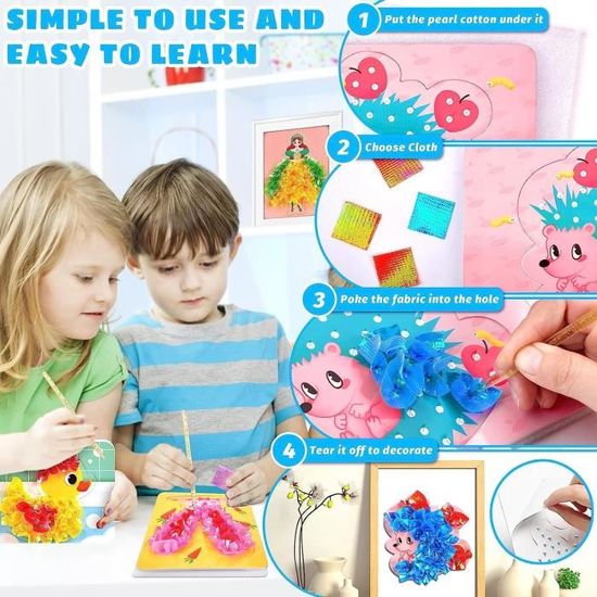 DÉVELOPPEMENT DE LA MOTRICITÉ FINE: Le Creative Puzzle Puncture Painting aide les enfants à améliorer leur dextérité et leur coordination œil-main. Reconnaissance améliorée des couleurs, contrôle du stylet formé, chaque type de jeu donne aux enfants plus d'espace pour une créativité indépendante et stimule la créativité et l'imagination des enfants. Des étapes simples pour que les enfants se concentrent sur le plaisir de créer.Plus qu'un simple jouet sensoriel anti-anxiété, ce kit manuel renforce la motricité fine des enfants de 4 à 8 ans, stimule leur créativité et améliore leur concentration Jouet de Bricolage Art de Poke, Rêve Infini d'enfance Peint à la ain... Caractéristiques: Nom: Childhood Infinite Dream Hand-Painted Matériau : Carte en papier + tissu liste de colisage: 10 * plaque de fond 1 * stylo à piquer 1 * coton perlé 600 * tissu coloré Utiliser: Placez le coton perlé sous la plaque de fond; Choisissez le tissu que vous voulez; Utilisez le stylo pour enfoncer le tissu dans les trous de la plaque de fond. Non seulement ce cadeau est amusant, mais il contribue à leur croissance et à leur développement personnels. En raison des différents effets de moniteur et de lumière, la couleur réelle de l'article peut être légèrement différente de la couleur montrée sur les images. Ainiv 12PCS Jouet de Bricolage Art de Poker de Princesse la jouet art de poke est un cadeau idéal pour les enfants pour Noël, Halloween, les anniversaires et autres célébrations et dans la vie de tous les jours. IDÉAL POUR UN CADEAU : tout enfant qui aime dessiner et modéliser adorera ce livre. Push Pin Poke Art Kit De Bricolage Pour Enfants Avec Base LED For Adults 💡 Stimulation sensorielle: Fournit des expériences sensorielles engageantes pour les enfants. SPÉCIFICATIONS Taille du produit: 210x150x60mm Age: 3 ans et plus EMBALLAGE INCLUS stylo à piquer*1/ support à piquer*10/ paquet de tissus colorés*600 pièces/ coton perlé*1 feuille REMARQUES Veuillez permettre de légers écarts de mesure dus à la mesure manuelle. Les enfants choisissent une carte autocollante, la placent sur le coussin éponge, choisissent leurs morceaux de tissu colorés les uns après les autres et utilisent un bâtonnet pour les enfoncer dans les trous du dessus de la carte autocollante.
