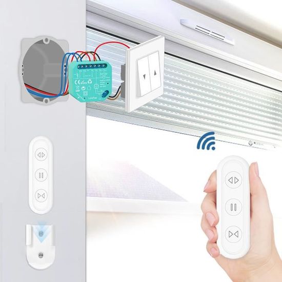 Anvek Interrupteur volets roulants RF, télécommande pour volets roulants électriques, contrôle de l Montage simple en quelques étapes simples (voir description). Cet appareil sans fil vous permet de gérer les volets enroulables à distance via une application intelligente, offrant un contrôle complet et pratique. Ce module de commande sans fil est la solution idéale pour moderniser votre système d'obscurcissement et profiter d'un confort et de sécurité. Vous pouvez également créer une scène « ouvre + retard (20s) + pause » ou « fermer + retard (30s) + pause » et activer la scène dans l'application Alexa, afin que vous puissiez ouvrir / fermer partiellement le volet roulant avec Alexa. Ce module de rideau Wi-Fi rf permet de transformer un simple volet électrique en un Smart qui contrôlable via le smartphone ou les dispostions vocales comme Amazon Alexa et Google Home. Minuteur et calendrier : vous pouvez régler une heure d'allumage ou d'extinction, ou vous pouvez créer une liste d'horaires du lundi au dimanche qui allume et éteint dans les horaires réglés, simulant votre présence à la maison même lorsque vous êtes hors pour les vacances Nous avons tous les accessoires dont vous avez besoin dans l'emballage, vous n'avez pas à payer de frais supplémentaires. Veuillez diviser 2,4 GHz et 5 GHz sur le routeur Wi-Fi pour obtenir un séparateur de 2,4 GHz pour la configuration. Donc, pour contrôler le volet roulant avec Alexa en disant ouvrir/fermer le volet roulant au lieu de allumer/éteignez le volet roulant, vous devez créer une scène, comme ouvrir le volet roulant dans l'application Smart Life et activer la scène dans l'application Alexa, puis vous pouvez contrôler le volet roulant avec la commande ouvrir le volet roulant. Grâce à sa technologie RF, il ne nécessite aucun câblage et peut être installé rapidement. [Fonction pourcentage] Vous pouvez utiliser la fonction pourcentage via des haut-parleurs intelligents et des téléphones portables. De même, vous pouvez obtenir de pauser le volet roulant en disant « pause le volet roulant ». 3 câbles pour le câblage. Commande Volet Roulant Sans Fil Anvek Interrupteur Volets Roulants RF, Télécommande Pour Volets Roulants électriques Fonctionne Contrôle App Smart Life, Module De Commande Sans Fil Pour Volets Roulants, Relais 300 W (4 Module Volet Roulant Connecté Volets roulants électriques et solaires vers Toulouse à Bessières Dimensions du produit : 3,8 x 3,8 x 1,8 cm., Norme Wi-Fi : 2,4 GHz 802., 11 b / g / n (ne prend pas en charge le Wi-Fi 5 GHz). Consommation en veille : inférieure à 0,5 W. Câblage : fil neutre Charge maximale : 300 W. qui nécessite un réseau séparé de 2,4 GHz pour l'installation. Par exemple: Alexa Réglez les rideaux à 20 %, 50 % ., ., ., (Remarque : les chiffres pourcentages ne peuvent être que multiples de 10). Grâce à la télécommande, vous pouvez facilement contrôler les volets roulants difficiles à atteindre depuis le canapé. 1 manuel d'utilisation en anglais (français non garanti). Contenu du colis : 1 x module interrupteur pour tente intelligente Wi-Fi. Télécoande volets roulants Gamme d'applications: ensemble de contrôle radio pour volet roulant, commutation facile et contrôle des moteurs électriques pour volets roulants, tentes, auvents solaires et protection solaire. Grâce à la télécommande, vous pouvez facilement contrôler les volets roulants difficiles à atteindre depuis le canapé. Aide confortable pour les personnes malades et physiquement handicapées Le relais volet roulant Wi-Fi fonctionne uniquement via l'application Smart Life/Tuya Smart fournie par Tuya Inc.