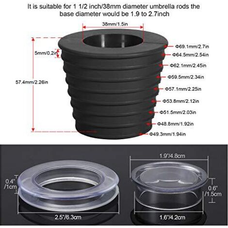 Le coin de cône parapluie convient aux pôles de parapluies de diamètre de 1,5 pouce de diamètre et peut être utilisé pour des terrasses de poids de 2,7 pouces de diamètre ou 1,9-2., 7inch. Le support de base de la table parasol peut être utilisé en combinaison avec n'importe quelle table et parapluie, convient à toute table à manger, parasol, parapluie de terrasse, etc. Installation facile - s'installe en quelques secondes, simplement pousser, tordre et tourner jusqu'à ce qu'elle soit complètement insérée. Table De Patio Cône De Parapluie Côte Coin De La Table Parasol Bague Outsunny propose un plateau de table instantané qui s'adapte instantanément à votre piscine Patio Table Parapluie Trou Cercle - Ensemble de coins en caoutchouc à cône pour parasol, anneau de support pour trou de table résistant, réduit le mouvement... Caractéristiques Cône de parapluie de table de patio -La couleur noire., -Matériel: caoutchouc., -Size: Hauteur: 5., 74cm / 2., 26inch; Diamètre intérieur: 3., 8cm / 1., 50inch. Lntyq Lot de 2 couvercles de trou de table pour parapluie... Le coin de cône de parapluie peut empêcher le poteau de parapluie de se gratter et de se denter à cause de frottement Paquet comprenant 2 * Cône de parapluie de table de patio 2 Pièces Anneau de Trou pour Parasol de Table Terrasse, Bague et