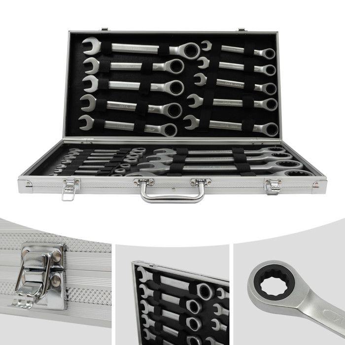 Caractéristiques :Dimensions dans le lot :6, 7, 8, 9, 10, 11, 12, 13, 14, 15, 16, 17, 18, 19, 20, 21, 22, 23, 24, 27, 30, 32 mm. Qualité supérieure de la marque Haskyy. Dans un boîtier en aluminium pratique. Les clés à fourche sont d'une taille entre 6 et 32 mm. L'autre face de la clé est constituée d'un cliquet à 72 dents. Le set est bien rangé dans un coffret... Le set est bien rangé dans un coffret pratique verrouillable en acier, ce qui facilite autant le transport que le stockage. L’autre face de la clé est constituée d’un cliquet à 72 dents. Fabriqué en acier au chrome vanadium. Clé A Cliquet Clés Plates à Cliquet 22 Pièces, 6-32 Mm Jeu De Cles A Cliquet Lot de 22 clés à cliquet 6-32 mm - Jeu d'outils de clé à cliquet Informations techniques :Cliquet à 72 dents., Design mince. Ce set de 22 clés à cliquet couvre les tailles de 6 à 32 mm. En acier chrome vanadium résistant à la corrosion. La clé à cliquet permet de travailler dans...