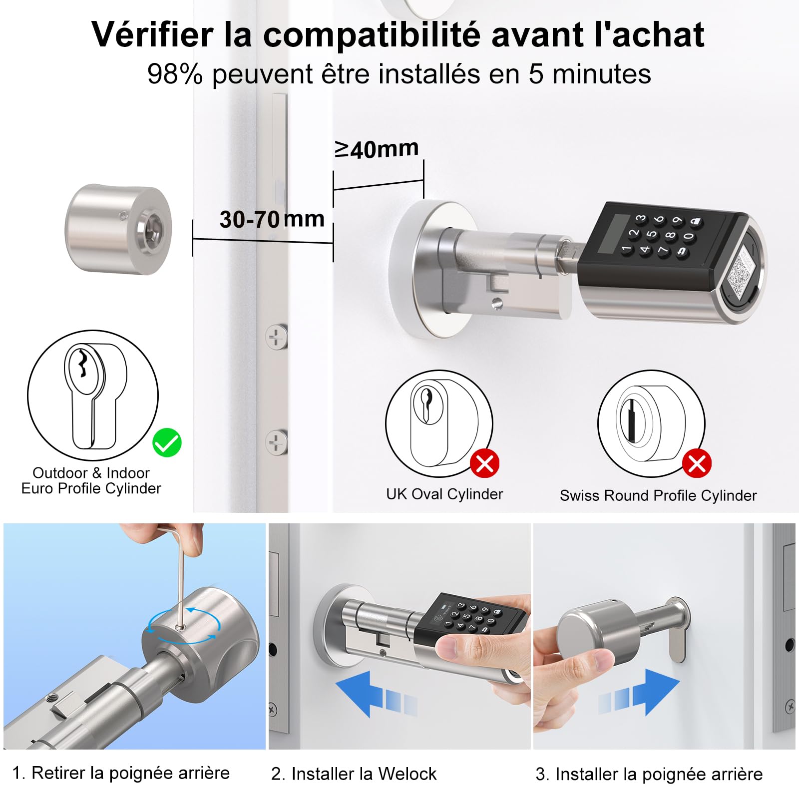 lock application à chaque fois et où que vous soyez. Dimensions des cylindre de serrure: Diamètre du poignées : extérieur 46 mm / intérieur 38 mm ; longueur : extérieur 56 mm / intérieur 57 mm. n'hésitez pas à nous contacter. Avec l' welock app, vous pouvez ouvrir / fermer la serrure porte ou faire des réglages et des autorisations. Il adopte une technologie avancée, vous permettant de gérer le verrouillage et le déverrouillage de la porte de manière intelligente. Contrôle du WiFi: welock serrure a code,déverrouillez la serrure verrou porte à distance via smartphone, contrôlez la serrure connectee porte entree depuis l'we. serrure connectee porte entree Si la batterie est épuisée, elle peut déverrouiller la serrure connectée via la clé de rechange USB. Stockage du serrure a code jusqu'à 10 groupes de mot de passe (1 d'entre eux avec fonction administrateur). Description du produit WELOCK PCB41WiFiBox Serrure Connectée WELOCK PCB41 Serrure Connectée,ous disposez de 5 méthodes de déverrouillage: Mot de Passe, Carte RFID, APP, WiFi et USB. welock serrure connectée 2., Les 3 Smart Cards incluses dans le package des welock serrure connectée peuvent être facilement associées à la serrure électronique fournie, et vous pouvez les utiliser pour verrouiller et déverrouiller la porte encore plus rapidement., serrure connectée 3., Il est possible d'associer jusqu'à 20 Smart Cards (autres Smart Cards disponibles sur notre site), de plus la welock smart card peut être associée à plusieurs serrures. Avec welock WiFiBox et welock serrure digitale, vous disposez de méthodes de déverrouillage par WiFi et Amazon Alexa pour votre porte d'entrée. Lot de 1 serrure électronique WELOCK PCB41, 1 WIFIBOX,3 cartes RFID, 1 clé Allen spéciale, 1 manuel d'utilisation. Déverrouillage par Mot de Passe et RFID Carte 1., Avec le verrou serrure connectee porte entree, vous pouvez facilement enregistrer différents mots de passe sur l'appareil, même personnalisés pour chaque membre de la famille ou du bureau. Serrure Connectée WELOCK ToucA51 Pro ,Serrure Empreinte Digitale Avec Password,RFID Carte Et APP,serrure à Code WiFi,Cylindre Connecté 40×30 Pour Porte De 50 à 100mm,Facile à Installer,Smart Lock Echo Show 15 Avis clients · Facilité d'utilisation (4,9/5) · Rapport qualité / prix (4,5/5) · Performance (4,7/5) · Simplicité d'entretien (4,3/5 La distance du centre du trou de la serrure au cadre de la porte est supérieure ou égale à 40 mm. Garantie: Si vous avez des questions sur l'installation, le fonctionnement, etc. Applications disponibles pour iOS et Android. Méthodes de déverrouillage pratiques: Ouverture de la porte par mot de passe, carte RFID ou application. serrure à code convient à l'épaisseur de la serrure de porte blindée de 50 mm-100 mm. Test : serrure connectée Welock Bluetooth et WiFi serrure connectée welock 2., Pour la sauvegarde de l' welock APP uniquement, déverrouiller l'alimentation, ne pas charger ! WELOCK Serrure connectée,serrure digitale avec RFID carte,Bluetooth APP... Avec notre application, vous pouvez ouvrir ou verrouiller la serrure connectée en toute sécurité via Bluetooth APP WELOCK., 2., Depuis l'app welock, vous pouvez également approuver ou annuler facilement les autorisations, afin de rendre l'accès à la pièce protégée par WELOCK serrure connectée limité et personnalisé., 3., De plus, vous pouvez générer des codes d'accès temporaires, valables jusqu'à 30 jours. L'appareil stocke jusqu'à 10 mots de passe en même temps (1 avec fonction administrateur). La serrure a code peut fonctionner avec Amazon Alexa, la commande vocale pour ouvrir et fermer la serrure à code. Veuillez noter que la batterie n'est pas incluse dans la livraison. Lisez les enregistrements, modifiez les codes de passe et supprimez la clé électronique à tout moment et en tout lieu, comme vous le souhaitez. vous saurez toujours qui ouvre la porte. Par exemple, si vous avez besoin de louer votre maison ou une chambre pour une courte période, avec welock pcb41 serrure connectée vous avez résolu le problème de la et de la restitution des clés !