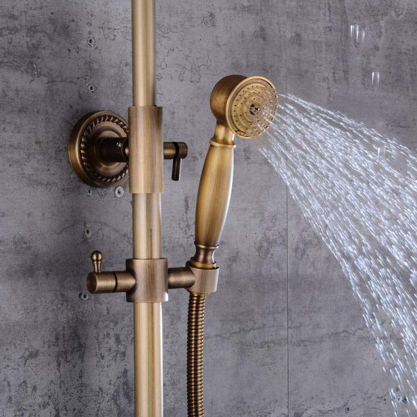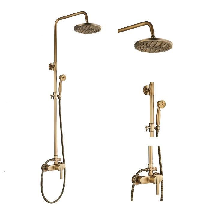 Design élégant : le style élégant et le design vintage du système de douche ajoutent une touche spéciale à votre salle de bain. Description de l'article : Le kit de douche peut être connecté à tous les systèmes d'eau chaude et froide courants. Dimensions : Voir image🔸Matériaux : Métal ABS🔸Matériau du robinet : Céramique🔸Finition : Laiton antique🔸Installation : Murale🔸Contrôle de l'eau : Eau chaude et froide🔸Nombre de poignées : Double poignée, double commande🔸Barre : Avec barre coulissante🔸Étagère incluse dans l'ensemble de douche🔸 ️Ensemble de douche universel : Compatible avec tous... Système de douche avec pommeau de douche à effet pluie. Contenu : 1 valve mélangeuse., 1 pommeau de douche., 1 douchette., 1 x tuyau., 1 support de support., 1 paquet d'installation. Facile à utiliser et prêt à l'emploi. Installation facile, il suffit de le connecter à la valve existante. Hudson Reed Elizabeth - Colonne de Douche Rétro avec Pommeau Pluie Fixe Réglable : le support mural réglable en hauteur rend l'installation rapide et facile. Convient aux personnes de toutes tailles. Matériaux : corps en cuivre, douchette en cuivre, aérosol en cuivre, tube en cuivre. AJW-Colonne De Douche Pluie Réglable En Hauteur Ensemble De Douche Nombre de trous de fixation : 3. Plage de hauteur réglable de la barre de douche : 85-132 cm. Finition : antique Méthode d'installation : montage mural Type de... Deux sorties d'eau : douche à effet pluie et douchette. Spécifications techniques : Finition : finition bronze.