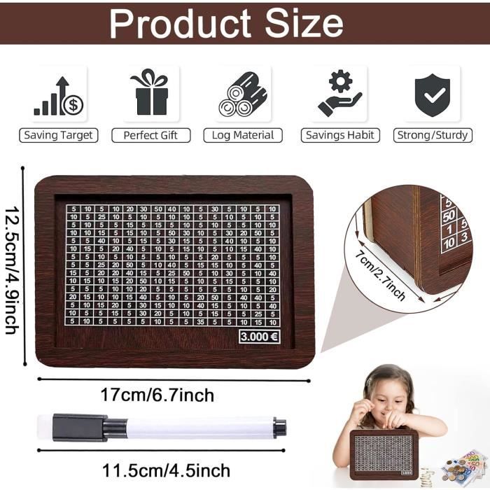 La tirelire dispose de trous spéciaux pour les pièces de monnaie et les billets. Tirelire avec chiffres sur la surface desquels différents chiffres sont imprimés, vous devez déposer le montant imprimé sur la boîte et cocher le montant. Peut être utilisé comme boîte à dons ou comme décoration vintage, placé sur un comptoir, ce qui le rend plus élégant dans le salon, la chambre ou le bureau. Tirelire en bois, pot d'épargne, durable, boîte à monnaie rétro, pot de banque portable pour acheter à prix bas - livraison gratuite, avis réels avec des photos Conseils : En raison de la mesure manuelle, la taille et le poids peuvent présenter une légère erreur. Tirelire Voyage Adulte Akozon Boîte De Rangement Rétro Boîte De Rangement De Bijoux Rétro En Bois Organisateur De Tirelire Trieuse Et le montant de l'objectif d'épargne rend l'économie facile et amusante, comme briser les niveaux. Contenu de la livraison : 1 tirelire 1 marqueur. ● Poids du colis : 242 g. Tirelire en bois réutilisable – Boîte de rangement rétro pour développer l'habitude d'épargner – 5 000 pièces. Pourquoi acheter cette tirelire rétro en...