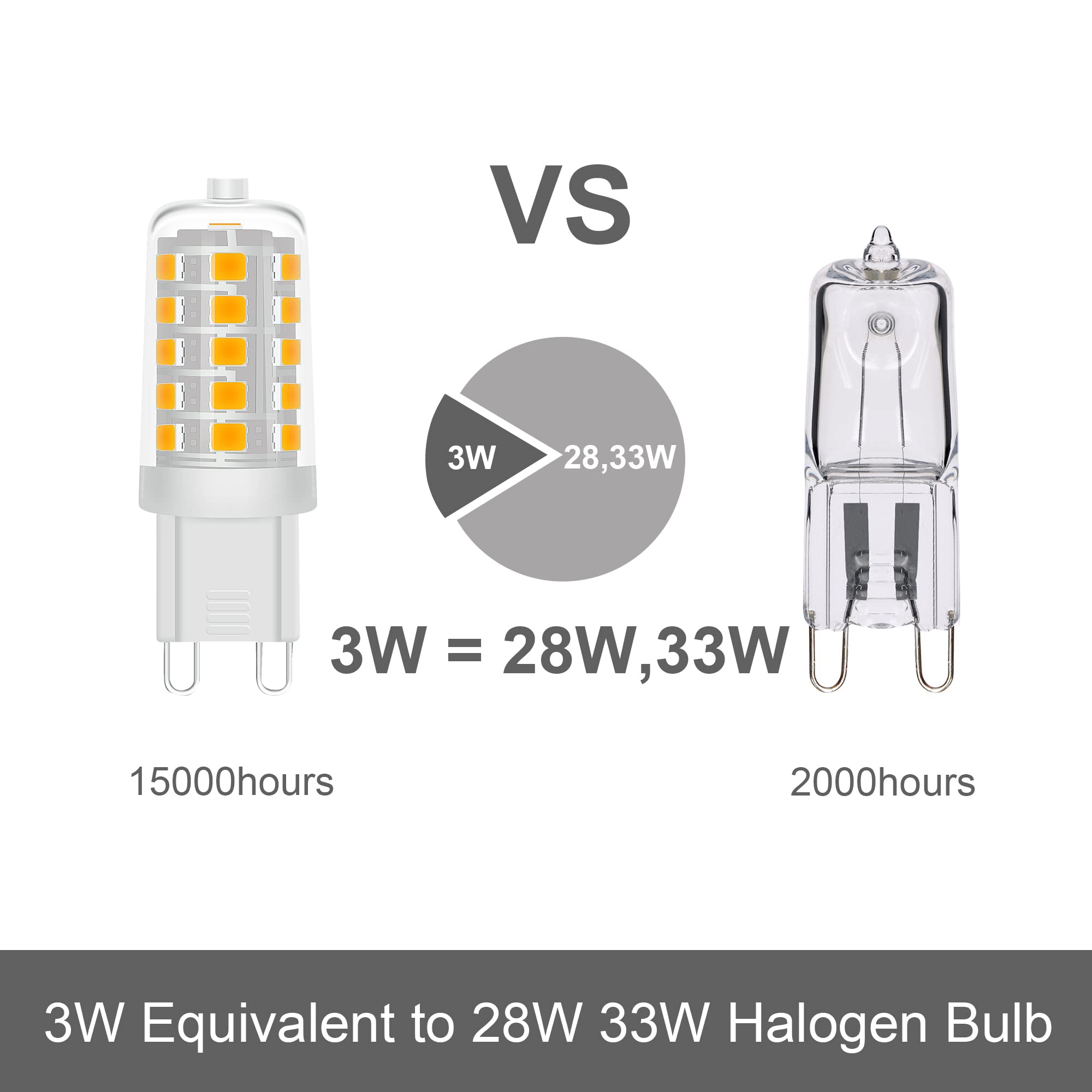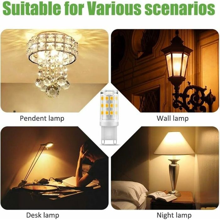 [ Détails du produit ] ※ Prise : G9 ※ Dimmable : Non dimmable ※ Tension : AC 220-240V ※ Luminosité : 360LM ※ Puissance équivalente : halogène 33W ※ Température de couleur : Blanc chaud 3000K ※ Angle de faisceau : 360° ※ Rendu des couleurs (IRC) : 85 Ra ※ Classe énergétique : A ※ Durée de vie : 30000H ※ Dimensions : D16., 6 x H47., 5mm ※ Matière : PC + Céramique ※ Garantie : 3 ans de garantie [ Warm Tips ] 1., Coupez l'alimentation avant de remplacer la lampe g9 2., L'ampoule led g9 n'est pas dimmable, veuillez ne pas l'utiliser dans le gradateur, ou cela provoquera un scintillement ou du bruit des ampoules 3., Veuillez vérifier les spécifications pour vous assurer que ces ampoules led g9 s'adaptent à votre luminaire avant d'acheter. Allumage instantané avec pleine luminosité. Lumens : 360 Lumen, classe d'efficacité énergétique A, 3000K blanc chaud Ampoule Led Ampoule G9 LED, 3W Equivalent 30W G9 Halogne, 300LM, Blanc Chaud 3000K, Sans Scintillement, AC 220V, NON-Dimmable, Lot De 10 - Maison Ampoule Halogène Ampoule LED XXCELL BI PIN - G9 3,3W équivalent 35W x2, ces ampoules sont idéales pour remplacer les ampoules halogènes à culot G9. Découvrez notre ampoule LED G9 sans scintillement de 3W, l'alternative idéale et écologique aux ampoules halogènes traditionnelles. Avec une consommation énergétique réduite de seulement 3 watts, elle offre une luminosité équivalente à celle d'ampoules halogènes d'une puissance allant de 20W à 33W, tout en étant plus économique et plus respectueuse de l'environnement Vous pouvez vérifier l'image ci-dessus pour les tailles d'ampoule., 4., Si vous recevez les ampoules défectueuses, ne vous inquiétez pas. Économie d'énergie] : Cette ampoule LED G9 3 W est une ampoule basse consommation. Comparée aux ampoules classiques, elle ne consomme que 3 W. De plus, elle peut remplacer une ampoule halogène de 40 W, économisant 90 % d'énergie et réduisant ainsi votre facture d'électricité. Sans scintillement et non variable, elle protège vos yeux de la lumière et crée une atmosphère... 👉【GARANTIE DE 3 ANS ET SATISFACTION À 100%】- Si vous avez des questions ou avez des suggestions avec nos ampoules LED G9, n'hésitez pas à contacter le vendeur directement. 👉【PAS DE CLIGNOTEMENT】: Une lumière sans scintillement et sans éblouissement empêche la fatigue oculaire et offre une atmosphère confortable et sans stress. Ampoules Led G9, 3W Equivalent 30W Halogène Lampe, Blanc Froid 6000K