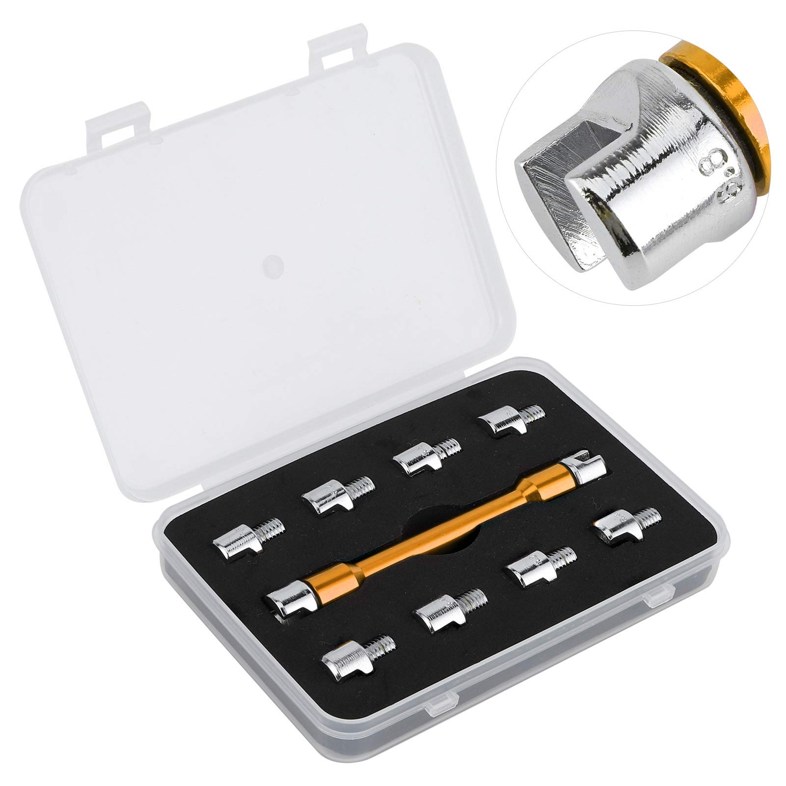 Longueur de la clé à rayons : environ 93 mm., Largeur : environ 12 mm. Fil de pneu réglable : ce jeu de clés à rayons de moto est spécialement conçu pour ajuster les fils d'acier des pneus. Polyvalent et pratique : le jeu de clés à rayons de moto est un outil polyvalent qui peut être utilisé à diverses fins. Jeu de clés CNC pour rayons de moto, longueur 5,0 à 6,8, 93 mm/3,7 Caractéristiques : Type d'article : clé à rayons de moto. Le design simple et direct élimine les étapes compliquées, ce qui le rend adapté à une utilisation avec la plupart des marques de motos, motos et motos tout-terrain. Clé à Rayons De Roue Universelle Réglable Akozon, Jeu De Clés à Rayons CNC De 5,0 à 6,8 Pouces, Longueur De Remplacement : 93 Mm/3,7 Pouces, Pour La Plupart... Le processus de fabrication professionnel garantit une performance stable, une haute précision et une fonctionnalité fiable. Il est résistant à l'usure, durable, et ne se casse pas facilement, assurant une longue durée de vie. Avec 10 tailles disponibles, vous pouvez régler rapidement et précisément la tension des rayons pour garantir une performance optimale de la roue. Que vous ayez besoin de régler la tension du fil des pneus, d'effectuer l'entretien de vos roues ou d'effectuer des réparations rapides en déplacement, cet ensemble est un ajout pratique à la trousse à outils de tout conducteur. Seigneur des Anneaux - Étui à lunettes | Le Seigneur des anneaux... Rangement Clef Ensemble De Clés à Rayons De Moto CNC, Longueur 5,0 à 6,8 Mm, Convient à La Plupart Des Motos, Avec étui De Transport, Utilisées Pour Régler Le Fil D' Acier Des Pneus (C Clé à Rayon Moto Têtes d'aspiration interchangeables : notre jeu de clés à rayons pour moto tout-terrain est livré avec des têtes d'aspiration interchangeables, permettant une personnalisation facile pour s'adapter à différentes tailles de rayons.