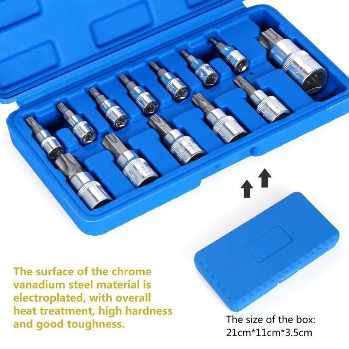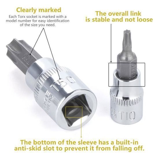 Clé Empreinte Torx Femelle E6/E8 - Feu Vert Clé à cliquet Torx femelle, fabriquée en acier au chrome vanadium de haute qualité qui fournit une plus grande résistance et durabilité face à l'utilisation. On peut régler, changer et relâcher rapidement. Jeu de 9 clés coudées Torx à deux embouts. Le jeu dispose de clés avec des dimensions T10, T15, T20, T25, T27, T30, T40, T45 et T50. Le jeu de clés angulaires Torx avec une multitude d’utilisation grâce à la combinaison de différentes dimensions de clés. Conception robuste : en acier trempé pour un couple de rotation optimal. Grand confort : sa longueur permet un effet de levier... Douille métrique longue de 1/4 | Fabriquée en acier au chrome vanadium | Dimensions de la... [Champ d’application] Cette clé est conçue pour être utilisée pour le bricolage domestique, les pièces de l'automobile, la menuiserie, l'entretien mécanique, etc. FACOM DOUILLE TORX E5 FEMELLE 1/4 Nous répondrons à vos questions dans les 24 heures. Disponible en différentes dimensions. Elle peut être utilisée pour le bricolage domestique, la menuiserie, l’entretien mécanique, etc. Clés à œil doubles E-Torx (E6xE8 à E20xE24). Ce type de clé à haute résistance est excellent pour augmenter la puissance de rotation.