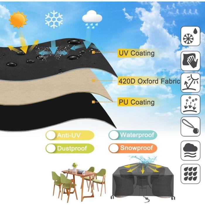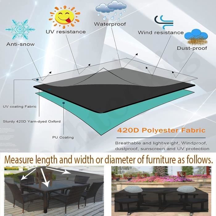 Description du produit Caractéristiques Type: Housses pour Salons de Jardin Matériau : Tissu Oxford 420D Taille: Longueur * Largeur * Hauteur Couleur: Noir/Argent/Vert/Beige/Marron/BeigeBrown 【Propriétés】 1., Conception coupe-vent - cordon de serrage réglable et 4 boucles sur le bas de la housse., 2., Protection imperméable et UV - Le revêtement argenté intérieur peut empêcher efficacement les meubles de jardin en bâche d'être endommagés par la forte lumière du soleil et la pluie., 3., Idéal pour une utilisation en intérieur et en extérieur, les nécessités de la vie. Il est très facile à laver, il suffit d'arroser la housse avec de l'eau et de la sécher au soleil. ✦【Protection Totale Du Meuble】-- Cette housse de mobilier de patio durable et résistante aux déchirures est également résistante aux UV et hydrofuge, protégeant vos meubles de patio de la saleté, de la pluie, des déjections d'oiseaux, de la neige et plus encore, Protection durable pour votre mobilier d'extérieur. EN STOCK : Housse protection table jardin pas cher. Grand choix, promos permanentes et livraison rapide partout en France. Paiement sécurisé Protège vos meubles de jardin contre la pluie, les ravageurs, les débris, la saletés,le sève des arbres, les fientes d'oiseaux, la poussière et le soleil. Aidez... Exterieur Housse Table De Jardin Impermeable - Leroy Merlin Housse Salon De Jardin ✦【Conception de Détail】-- Nos housses de meubles de patio comprennent 4 boucles coupe-vent robustes et 1 cordon de serrage réglable. Housse Salon De Jardin ZFEBHMY ,Tissu Oxford 420D Résistant vous propose une housse rectangulaire pour salon de jardin dans de nombreuses tailles. ✦【Facile à Nettoyer et à Ranger】-- Housse de mobilier de jardin durable est facile à installer et à retirer et est livrée avec un sac de rangement pratique qui est pratique à ranger lorsqu'elle n'est pas utilisée. La Rechteckig Housse Salon de Jardin est compatible avec la plupart des meubles rectangulaires ou carrés, y compris les meubles de patio, les meubles de balcon, les meubles de jardin, les meubles de salon, le groupe de sièges de table de jardin, les chaises, le canapé et le coffre de rangement pour banc de jardin.