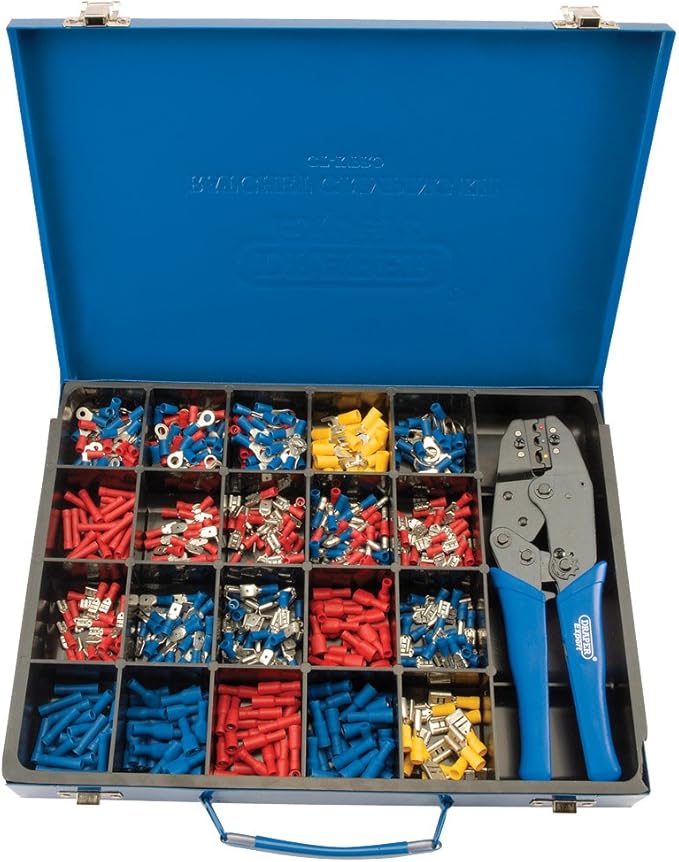 ) bornes préisolées mélangées dans un étui de rangement en acier avec insert., Présentoir emballé. Dimensions de l'emballage : 35., 1 x 27., 4 x 5., 2 cm Poids du colis de l'article : 2., 97 kg Draper 56383 Expert Pince à sertir et kit de bornes à cliquet, bleu Convient pour sertir les bornes isolées comme suit : - Canal rouge : 0,5-1,00 mm², canal bleu : 1,5-2,5 mm² et canal jaune : 4,0 à 6,0 mm². Fourni avec 590 (environ ) Bornes pré-isolées mélangées dans un étui de rangement en acier avec insert Draper Tools Ensemble d' outils à sertir et à cliquet 56383 - Reconditionné - Draper Tools ; Produit Neuf. Ou 39,93 € /mois ; LIVRAISON RAPIDE ; Livraison gratuite... Draper Expert 56383 - Crimpatrice A Cricchetto Kit de sertissage à batterie Cembre avec matrices KIT B1300 C 1