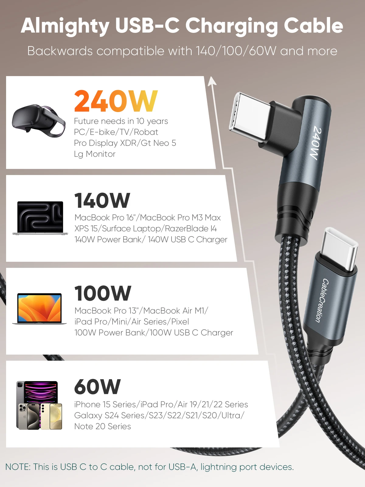 Évitez les enchevêtrements et les ruptures. Fonction : transfert de données, charge Taux de transfert : 480 Mbps Puissance de charge : max., 5 V/2 A. Description du produit Charge rapide 65 W/3,25 A transfert de données USB 2.0/480 Mbit/s. 2) Haute vitesse jusqu'à 480 Mbit/s pour USB Type-C 2.0, prend en charge le transfert de données bidirectionnel simultané. 3) Ce câble coudé vous permet de le connecter à une prise femelle, même dans des espaces limités. 4) L'utilisation de fils en cuivre au lieu de câbles en cuivre... Contenu de l'emballage : 1 câble de données court 90 degrés USB type C mâle plat et souple. Sans vous soucier des câbles emmêlés et désordonnés. Facile à transporter : le câble plat USB type C court de 50 cm vous aide à éviter les enchevêtrements de câbles. Le câble USB C plat court à 90 degrés peut répondre à vos différents besoins quotidiens lors du chargement à la maison, en plein air, en voiture, au bureau, etc. USB C câble plat court USB 2.0 Type C double coudé à 90 degrés PD 65 W Câble plat USB type C 2., 0 à 90 degrés : le design en L à 90 degrés vous permet d'accéder aux endroits difficiles d'accès tout en protégeant le port USB de votre appareil contre les branchements et débranchements fréquents. afin de garantir la durabilité et la durabilité. (Remarque : la vitesse de charge réelle dépend de votre appareil et du chargeur mural) Baseus USB-C Cable With CableCreation 240W Câble USB C Vers USB C Câble USB2.0 à Angle Droit Cable Usb Usbc Charge rapide PD 65 W et synchronisation des données : câble plat USB type C 2.0 à 90 degrés, vitesse de transfert de données peut atteindre 480 Mbps. ... Câble d... Il est plus durable et plus flexible. Fabriqué en matériau TPE de qualité supérieure pour câble plat souple, il est facile à plier, pas facile à endommager et durable.