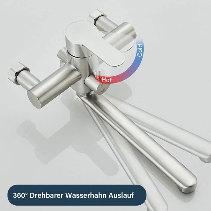 Caractéristiques : Matériau : acier inoxydable. 1 x accessoires de montage. Fonction : mélange d'eau chaude et froide. Le débit d'eau en mousse souple peut arrêter l'eau et affaiblir le bruit du flux d'eau. Le montage mural libère le plan de travail ou le lavabo et le design pivotant vous permet de transporter l'eau là où vous en avez besoin. Le robinet de cuisine à levier unique est adapté pour régler le débit et la température de l'eau d'une seule main Mitigeur Mural Robinet De Cuisine Mural élégant Inovra® Avec Bec Pivotant à 360° Et Doubles Commandes Mitigeur Cuisine Mural Avec Bec 【Peut pivoter à 360 °】Le robinet de cuisine est rotatif à 360 ° et est adapté pour les éviers doubles, de sorte que vous pouvez nettoyer chaque coin de l'évier confortablement. Matériaux de haute qualité : fabriqué en acier inoxydable pour une protection contre l'oxydation et la Température illimitée et quantité d'eau : en raison de la haute qualité intérieure de l'accessoire, vous pouvez déplacer le levier très facilement, l'interface standard allemande est de 1/2 sur l'écrou Raccordement direct de l'eau chaude et froide. Pression de l'eau : 0,5-7 bar. 【Facile à installer】Grâce à la qualité intérieure du robinet, vous pouvez déplacer le levier très facilement, raccord standard allemand 1/2 sur l'écrou de raccordement. Robinet Mural Cuisine, Mitigeur Mural Inoxydable, Pivotant à 360° pour Évier de Cuisine, Eau Chaude et Froide, Trous de Montage Réglables, Bras Pivotant 23cm, Brossé : : BricolageDemandez le retour de ce produit dans les 14 jours suivant la réception, pour quelque raison que ce soit, afin d’obtenir un remboursement complet (prix de l’article et frais de livraison) dans le... 1 manuel d'installation (français non garanti). Température de l'eau : 65 °C., Débit : max., 2 Gpm (7,5 l/min)., Poids : environ 1,0 kg., Hauteur totale : 120 mm., Longueur : 195 mm., Longueur totale : 280 mm. Fonction : rotation à 360 degrés. Wasserhahn 360 ° Ausziehbar Küchenarmatur Brause Wandmontage Einhandmischer DHL Température de l'eau : 4 °C à 90 °C, recommandée. Caractéristiques du trou de fixation : G1/2., Contenu : 1 robinet. La pression d'eau minimale requise est de 0,05 MPa (0,5 bar). Ne convient pas aux basses pressions. Non seulement pour les éviers encastrés, mais aussi pour les éviers doubles. Avec l'interrupteur à une main, vous pouvez facilement contrôler le débit et la température de l'eau, il n'y aura pas de secousse. Il suffit de changer le robinet pour rafraîchir votre humeur et rendre votre vie quotidienne plus agréable.