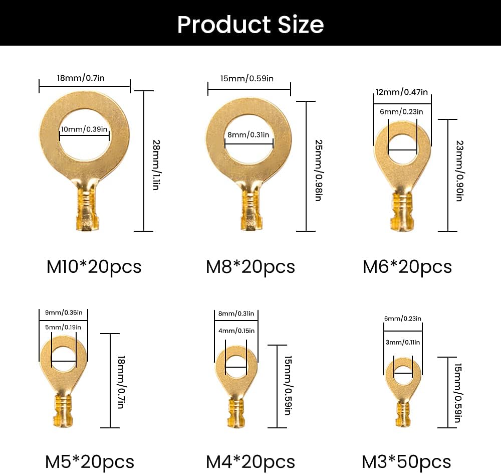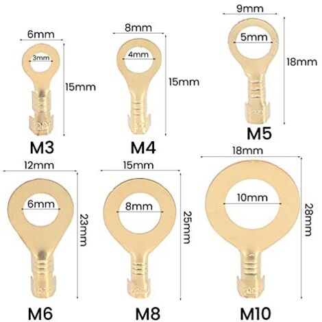 Quantité : 6 styles, 150 pièces. 6 types de terminal à bague M3 x 50, M4 x 20, M5 x 20, M6 x 20, M8 x 20, M10 x 20. Convient à tous les types de composants électroniques. Tous les connecteurs à sertir isolés sont parfaitement enfermés dans une boîte en plastique pour faciliter le rangement, le transport et l'organisation. Kit de terminaux à bague de haute qualité fabriqué en laiton de haute qualité, avec une... Achetez 150pcs Kit de cosse électrique Rond laiton Sertissage Lug M3 M4 M5 M6 M8 M10 Terminal de batterie pour moto / voiture / modèle / bateau / câble Connecteur. Connexion pratique - Connecteurs à barillet ouvert - Bonne conductivité électrique - Facile à connecter des fils et des câbles - Jouent en même temps un certain effet ignifuge - Assure la sécurité de l'électricité - Très pratique à utiliser. Il n'y a pas besoin d'utiliser une pince à sertir robuste. Types : M3, M4, M5, M6, M8, M10., Contenu : 50 cosses de câble M3., 20 cosses de câble M4., 20 cosses de câble M5., 20 cosses de câble M6., 20 cosses de câble M8., 20 cosses de câble M10., 1 boîte de rangement., Remarques : 1., La couleur de l'article peut varier de celle de la photo, en fonction des paramètres d'affichage et de luminosité de votre ordinateur., 2., Veuillez prêter attention à la sécurité électrique lors de l'installation et du démontage. Kit de terminaux à bague de haute qualité fabriqué en laiton de haute qualité, avec une conductivité élevée et une résistance à l'oxydation. Les connecteurs à sertir en laiton peuvent être utilisés pour connecter des fils et des câbles, sertis ou soudés, peuvent être utilisés dans les automobiles, motos, appareils ménagers, ordinateurs, navires, ordinateurs ou applications en plein air et d'autres domaines. 6 types de terminal à bague M3 x 50, M4 x 20, M5 x 20, M6 x 20, M8 x 20, M10 x 20., Convient à tous les types de composants électroniques. Design à barillet ouvert : le connecteur de terminal a un design à barillet ouvert, ce qui est très adapté pour les fils solides ou multibrins. Cosse Batterie Moto TIANYI-Lot De 150 Cosses De Câble électrique En Laiton Pour Voiture M3 M4 M5 M6 M8 M10 Cosse électrique Lot de 100 cosses pour câble électrique laiton non isolée cylindre mâle... 150pcs Cosses Electriques Oeillet Ronde en Laiton Cosses de câble