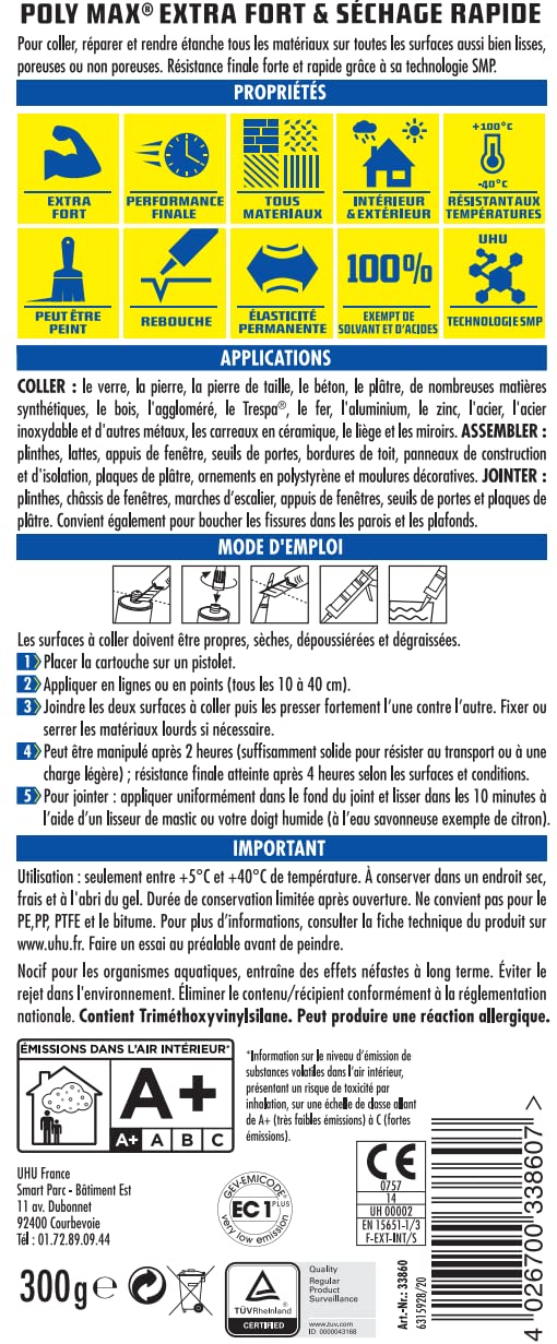 Forte adhérence initiale Pour une utilisation en intérieur et en extérieur Sans solvant, sans acide, sans odeur Clair et transparent comme du cristal. Pour coller, assembler et étancher presque tous matériaux sur presque tous supports (lisses, poreux, non poreux et... Colle de montage transparente et mastic avec une haute résistance et une adhérence immédiate super rapide : pour tous les matériaux, surfaces et applications en intérieur et en extérieur : collé, monté et étanche, collage élastique permanent, très haute adhérence initiale en un temps record, très haute résistance à l'eau et aux... Polymax Mode D'emploi UHU Colle De Montage Poly Max Sofort Power Transparent 300 G Uhu Polymax Msp UHU Polymax prise immédiate invisible- Mastic/colle MSP pour coller, assembler et jointer, ultra