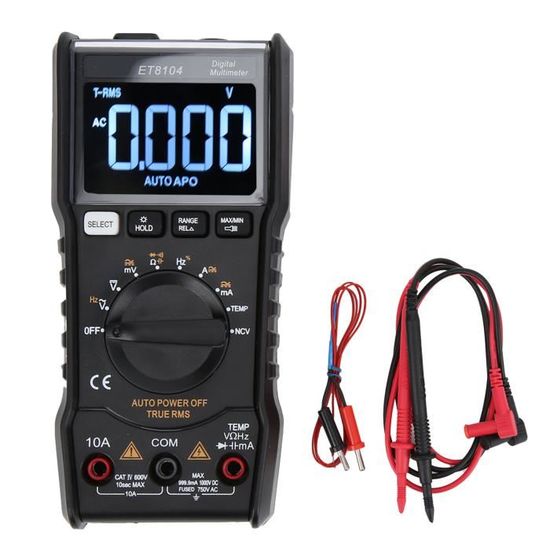 Environnement de travail: 0 à 40 degrés Celsius, humidité relative : Alimentation : 2 piles AAA de 1,5 V (non fournies). 1 manuel d'utilisation en anglais., 1 câble de test. Klein Tools CL390 Pince ultiètre nuérique, affichage de contraste inversé, plage autoatique Test de tension AC/DC, courant AC/DC, résistance, ligne sous tension, diode, continuité. Taux d'échantillonnage : 3 fois par seconde. Dimensions : 130 x 65 x 32 mm. Caractéristiques : Enregistrement des données., Plage automatique. Temps d'échantillonnage à environ 2 ~ 3 fois/sec, affichage maximum de 2 000 comptes. Indication de surcharge : OL. Multimètre Numérique Stylo, Testeur De Tension, Testeur De Résistance De Diode De Continuité De... Ne pas appliquer une tension supérieure à la tension nominale, marquée sur le compteur, entre la borne d'entrée et la borne de mise à la terre. NK-51A Multimètre Numérique Rétroéclairé Avec Plage Mesure principale : tension AC/DC, courant AC/DC, résistance, diode et test de continuité. Deuxième rétroéclairage. Couleurs : noir et bleu. Identification de polarité - Indication de basse tension. Normes EN61010-1-2-030 CAT-III 600V CAT-II 600V