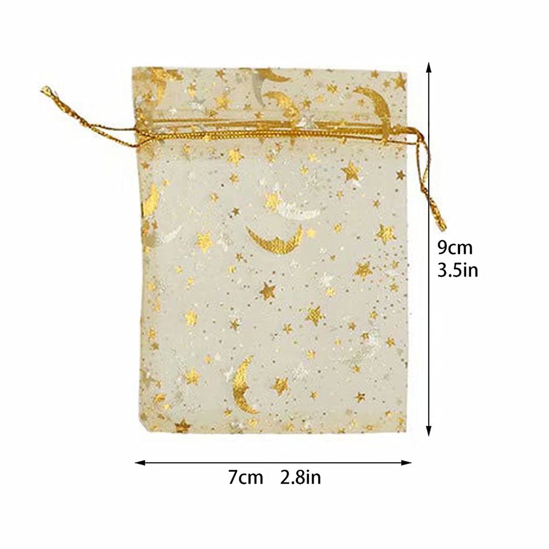 Ils sont faits de matériau en organza transparent de haute qualité avec de l'or cordon sac de liens pour le fermer en toute sécurité. Nombreuses utilisations : ces sacs en organza peuvent être utilisés pour stocker des aliments, emballer des cadeaux, stocker des voyages, et garder certains articles tels que des collations, des pots de crème, des bijoux, des pièces de monnaie, des bonbons lors de fêtes, du matériel d'expédition ou d'autres petites pièces métalliques. Vous pouvez stocker vos essentiels quotidiens. Lot de 100 pochettes à bijoux en organza avec motif lune et étoile Facile à utiliser : chaque sac est livré avec deux cordons de serrage plats aux deux extrémités, ce qui rend les sacs ouverts ou fermés facilement, et vous pouvez également transporter facilement vos articles avec les cordes. Qianhailizz 100 Lune étoile En Organza Bijoux Pochette Cadeau Candy Excellent pour la décoration, de mariage et de fête. Elles sont également légères et portables à transporter. Matériau de qualité supérieure : ces pochettes cadeaux en organza avec cordon de serrage sont principalement fabriquées en tissu organza, qui est sûr, robuste, lavable et pas facile à casser, vous pouvez les utiliser pendant une longue période. Matériau fiable : le sac en organza étoile de lune est composé de tissu organza de qualité, avec des points soignés et bien fabriqués et un motif étoile de...