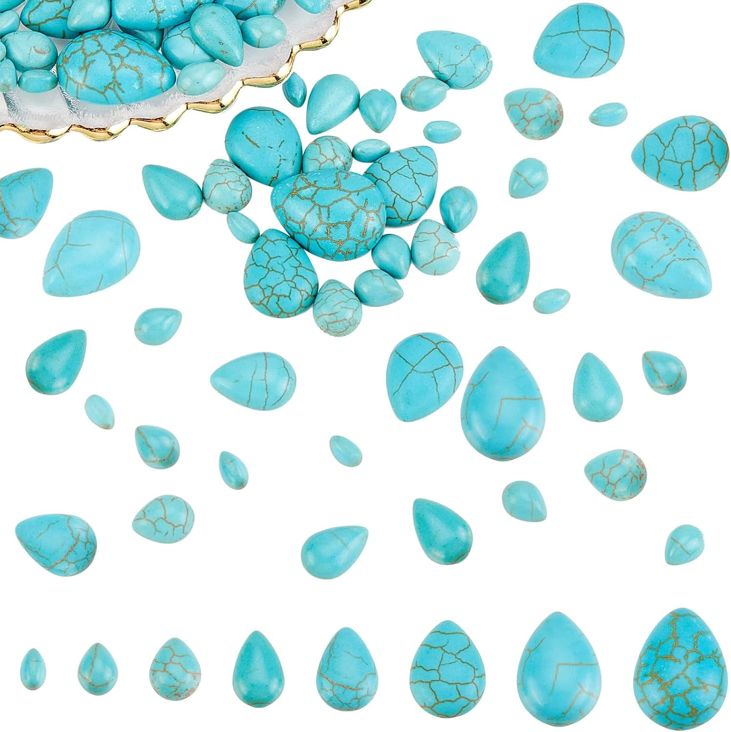Applications larges - Ces cabochons de pierres précieuses peuvent être utilisés pour les colliers, Des boucles d'oreilles, bracelets et autres bijoux. 2 styles, 14 tailles – Le paquet contient 132 cabochons synthétiques turquoise de 2 styles, ronds et ovales. Et il y a 14 tailles au choix, veuillez vérifier attentivement le tableau des tailles sur la page détaillée et choisir les cabochons dont vous avez besoin Bon pour l'artisanat et la décoration intérieure. Et il y a disponible en 14 tailles au choix, Veuillez vérifier attentivement le tableau des tailles sur la page détaillée et choisir les cabochons dont vous avez besoin., ! 100PCS Turquoise Gemstone Cabochons Pour DIY Burundi 10 teile/los 4-30mm Natürliche Stein Türkisen Verkrustete Cabochon Perlen Flatba Crackle Design - La fissure à l'extérieur est un design unique, donner aux gens un sentiment rétro et noble. Chaque cabochon a des rayures différentes, ce qui signifie que les bijoux que vous fabriquez sont uniques!