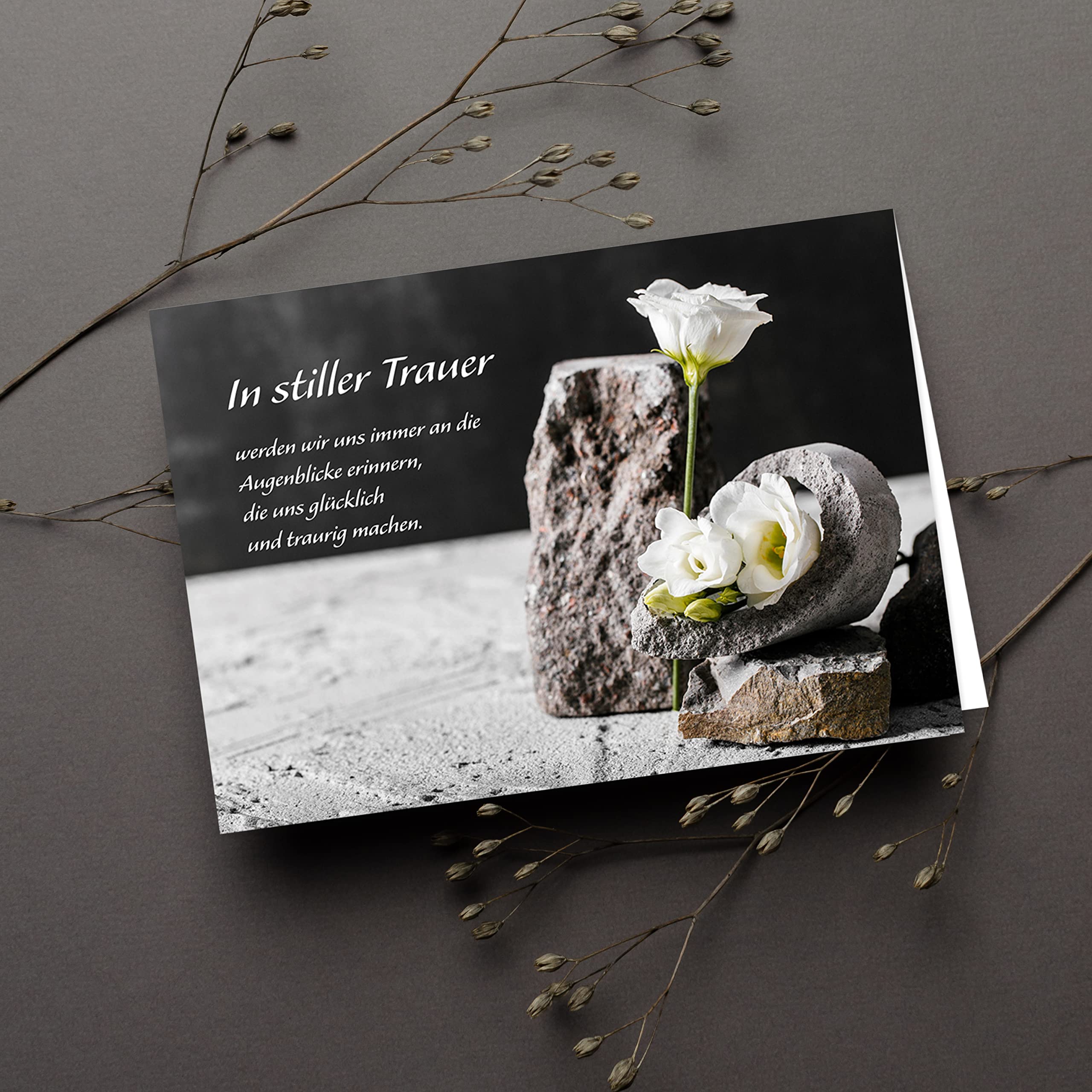 Fleurs pour enterrement, crémation. Préparer les obsèques et le deuil Lot de 8 cartes de condoléances avec texte et enveloppe - Cartes pliantes avec inscription en allemand « funérailles » - Élégantes fleurs blanches délicates et pierres - Cartes de condoléances pour adieu - Cartes : ce lot se compose de 8 cartes pliantes / cartes doubles avec 8 enveloppes grises. L'intérieur dispose également d'un motif imprimé mais il y a assez d'espace pour écrire ou écrire vos propres mots., Enveloppes grises. Fleurs de deuil et condoléances à Alençon avec Atelier Floral La Pierre Blanche Une Carte De Condoléances Unique : Ensemencée Ou En Papier Bulbes Carte Condoléances Avec Enveloppe L'intérieur est également imprimé avec un motif, mais offre suffisamment d'espace pour écrire ou imprimer avec vos propres mots. Fabriqué en Allemagne : nos cartes sont fabriquées exclusivement en Allemagne. Les enveloppes sont grises. ✅ UTILISATION : une possibilité après un décès / funérailles à tous ceux qui ont apporté des condoléances, des condoléances et de la compassion à vous et à leur famille. ✅ Format : format carte postale A6, pliable ✅ Fabriqué en Allemagne : nos cartes sont exclusivement fabriquées en Allemagne. Peut inclure: Une carte de remerciement blanche avec un motif floral vert et une photo. Modèle numérique de carte de remerciement pour les funérailles, carte de... ✅ Design : élégant fleur blanche et pierre avec un beau texte, imprimé à l'avant et à l'arrière.