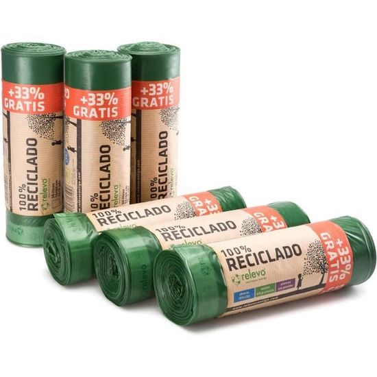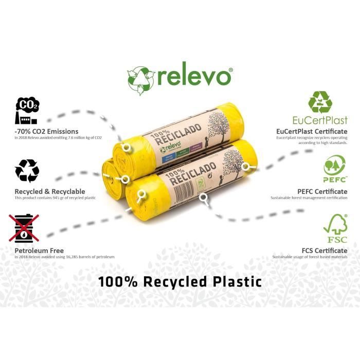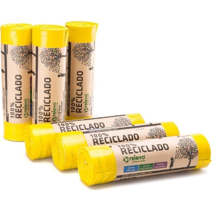 Chaque sac poubelle rectangulaire a une dimension de 55 x 60 CM Sac Poubelle 20l Sacs Poubelle 100% Recyclés, Très Résistant 30L, 45 Pièces & Sacs Relevo Sac Poubelle Recyclé Avec une résistance allant jusqu'à 25 kg, ce sac écologique est exempt des tracas expérimentés avec d’autres sacs poubelle biodégradables Contient 24 rouleaux de 480 sacs au total. Chaque sac poubelle rectangulaire a une dimension de 55 x 60 CM; Nous avons recyclé 10.1 kg de plastique pour... Comprar Bolsas de basura amarillas 100% reciclado para cubo normal 30 litros rol Chaque sac poubelle rectangulaire a une dimension de 55 x 60 CM Nous avons recyclé 315 Grammes de plastique pour produire ces 15 sacs poubelle recyclable Avec une résistance allant jusqu'à 25 kg, ce sac écologique est exempt des tracas expérimentés avec d’autres sacs poubelle biodégradables Système anti-goutte permettant de nettoyer les objets humides sans déversements salissants. Une résistance à la traction jusqu'à 25 kg évite les problèmes des sacs poubelle biodégradables standard. Système anti-fuites pour une élimination propre des déchets humides. Certifiés par l'Ange Bleu et le PEFC, les sacs poubelle Relevo assurent une amélioration de l'équilibre écologique par rapport aux sacs traditionnels. Avec une épaisseur de 30 microns, ces sacs de 30 L sont... Système anti-goutte permettant de nettoyer les objets humides sans déversements salissants. Nous avons recyclé 315 Grammes de plastique pour produire ces 15 sacs poubelle recyclable