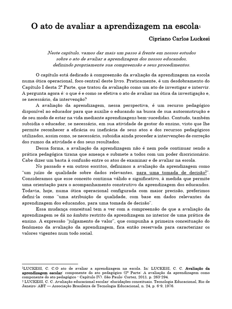 Pesquisa em educação comparada: abordagens e método Avaliação da Aprendizagem. Componente do Ato Pedagógico (Em Portuguese do Brazil) : : Office ProductsAos que se preparam para atuar profissionalmente como educadores nas instituições escolares de nosso país e do exterior, assim como aos que já trabalham como educadores, o presente livro oferece subsídios para melhor compreender o ato de avaliar a aprendizagem dos nossos... Componente Do Ato Pedagógico, De Luckesi, Cipriano No entanto, ainda que tenham nuangas sutis, todas implicam dois processos articulados ¢ indissocidveis: diagnosticar - acompanhando, monitorando a construgio do resultado almejado; ¢ in- tervir - testemunhando a qualidade final do que foi produzido, tendo em vista a melhoria dos resultados
