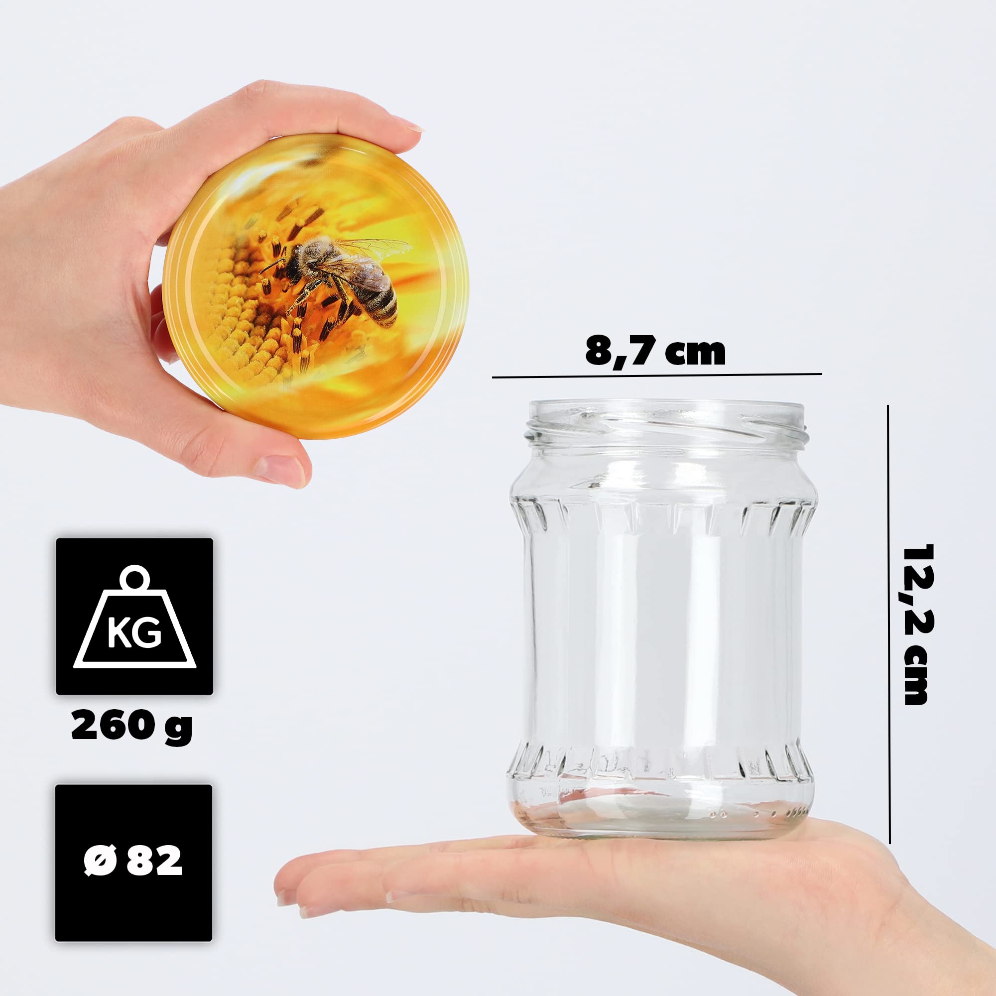 Diamètre : 6,35 cmDiamètre de l’embouchure du couvercle : 66 mm., Capacité : 230 ml., Poids : 0,16 kg. Dimensions : Ø 6,35 cm × H 9,7 cm · Contenance : 214 ml · Poids : 125 g par bocal. Nous recommandons expressément de n'utiliser ce type de bouchon qu'une seule fois et d'utiliser un nouveau couvercle lors d'un nouveau remplissage. Bocaux Twist Off KADAX Bocaux De 500 Ml, Pots En Verre Avec Couvercle Hermétique De 82mm Pour La Conservation Des Aliments, Idéals Pour Confitures Et Miel (Abeille, Lot De 16 Bocaux En Verre de Lot de 24 bocaux droits 214 ml avec couvercles Twist Off TO66 décor fruits – Pour soupes, purées bébé, dips, thés et herbes Explorez nos bocaux Twist Off par lot, parfaits pour la stérilisation de vos préparations. Découvrez une solution fiable et pratique Les couvercles Twist-Off peuvent être nettoyés à la main (sans utilisation de détergents agressifs). Espirito Rebelde Pack de 100 Pots à Confiture en Verre Vides 240 ml- Bocaux en verre, Bocaux pour Conserves et Confitures, Pot a Miel en Verre, Pot a Yaourt, Pot Sauce- Marriage [IDÉES CADEAUX CRÉATIVES] Ces bocaux peuvent être utilisés comme cadeaux personnalisés pour des anniversaires ou la fête des mères – parfaits pour des mélanges de thé, confitures, sels aux herbes ou mini gâteaux maison. [DESIGN CLASSIQUE & MATÉRIAUX DE QUALITÉ] Lot de 24 bocaux cylindriques de 214 ml avec couvercles Twist Off inclus. [FLASCHENBAUER – UN PARTENAIRE DE CONFIANCE] Haute qualité à un excellent rapport qualité-prix.