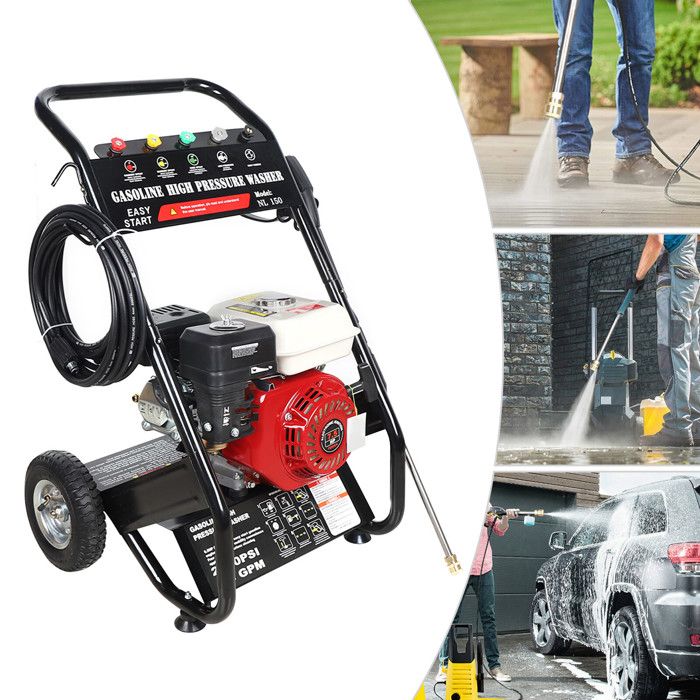 Haute sécurité : le tuyau de sortie est éloigné du silencieux (7,87) pour éviter une explosion due à une température excessive. 1 pistolet pulvérisateur avec tige d'extension. Haute efficacité : la pompe à cames axiale puissante et sans entretien de 7,5 CV peut fournir, avec un carburateur fiable et une forte perméabilité, une vitesse de rotation élevée de 3400 tr/min et une pression de 2200 psi (170-190 bars) à 2,3 GPM. Pistolet pulvérisateur de qualité supérieure : le pistolet pulvérisateur haute pression avec noyau en cuivre dispose d'une poignée ergonomique, d'un raccord rapide et d'une tige d'extension, de sorte que vous pouvez l'utiliser efficacement et facilement. 4) Allumez le pistolet jusqu'à ce que l'eau s'écoule. Vous pouvez pousser la boucle à l'extrémité du pistolet vers l'arrière pour remplacer rapidement les cinq buses. Matériau : fer, caoutchouc, PVC Traitement : peinture, anodisé. GPM (Galloper Min) mesure la quantité d'eau utilisée pour nettoyer et rincer les saletés avec une machine de nettoyage haute pression. Veuillez changer l'huile moteur et l'huile de pompe pendant les 10 premières heures, puis toutes les 100 heures., 8., Pour garder le moteur en bon état, veuillez l'inspecter et l'entretenir régulièrement., 9., Veuillez nous contacter afin que nous puissions vous envoyer la vidéo de fonctionnement et respecter les consignes de sécurité sur le boîtier de la machine. 3) Insérez le tuyau d'alimentation en eau dans l'eau. Boîte à savon incluse : oui. Longueur du tuyau haute pression : 8 m. La pompe à pulpe oscillante a une pression plus forte qui garantit une sortie d'eau rapide à haute pression, une quantité d'eau stable et un nettoyage plus approfondi. 5) Sélectionnez la buse souhaitée et connectez-la au pistolet pulvérisateur. Promo Nettoyeur Haute Pression 210 Cc Power Plus chez Brico Cash... Nettoyer à Essence électrique 500W Nettoyeur Haute Pression 30Bar 48V, Nettoyeur Haute Pression Portable 1 Batterie (EU) Pour Nettoyeur Haute Pression électrique 1 tuyau d'alimentation en eau., 1 tuyau chimique., 1 tuyau haute pression. 5 buses au choix : les buses à bulles 0°, 15°, 25°, 40° et noires conviennent pour le nettoyage de différentes saletés tenaces et répondent à différents scénarios de nettoyage. Veuillez lire attentivement le manuel d'utilisation avant utilisation. La combinaison de Psi et Gpm détermine la vitesse et l'efficacité du travail., 3., Veuillez maintenir le niveau maximum de carburant en dessous du bec de remplissage inférieur de 1/2 pour éviter tout débordement. 1 manchon pour bougie d'allumage., 1 filtre., 1 bouchon de purge. Nettoyeur Haute Pression Thermique 250 Bar 7CV 5.2KW Tuyau HP 8m Tres 4 Buses Vito Charge maximale : Débit : 2,3 GPM Diamètre des roues : 20,32 cm. Achetez maintenant chez VEVOR. Puissance : 7,5 HP Type d'essence : 92 ou 95 #. Caractéristiques techniques : Modèle : NL 150., Style : moderne., Couleurs : noir, rouge., Forme : rectangulaire. Contenu de la livraison : 1 nettoyeur haute pression à essence. 1 manuel d'utilisation en anglais. Longueur du tuyau chimique : 1 m. Le design insonorisé assure un fonctionnement silencieux et vous offre un environnement de travail confortable. Capacité du réservoir d'huile de pompe : 3,5 l/118,35 oz / 0,9 gal.