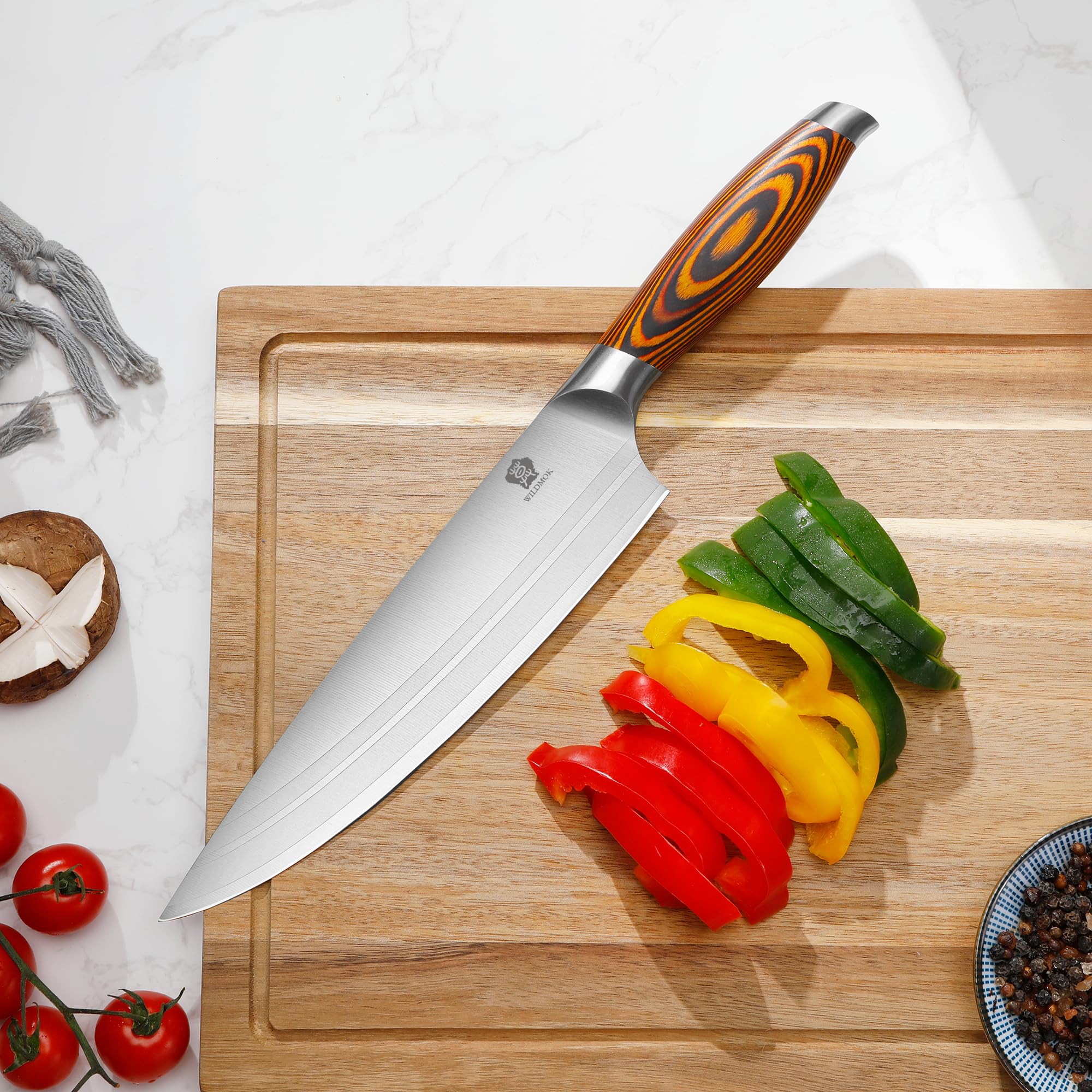 Chaque couteau est présenté dans un packaging de qualité et chaque collection possède son propre thème inspiré de la mythologie. Un couteau tranchant capable d'endurer une grosse charge de travail avec style. En acier inoxydable allemand de haute qualité, avec un HRC de 56 (parmi les... Forgé avec précision, affilé, tranchant et résistant à l’usure, il possède une HRC de 56., Ergonomique, élégant et durable, il deviendra le bourreau de travail de votre arsenal. Couteau de cuisine Sabatier Idéal Forgé - Couteau de chef 20 cm Nous avons opté pour une grande lame avec une courbure légère qui vous permettra selon vos préférences d’utiliser avec succès les techniques de découpe française ou chinoise. Balmung, notre couteau de chef 20cm, est un couteau de cuisine polyvalent qui convient aussi bien aux professionnels, chefs, traiteurs, bouchers, poissonniers qu’aux amateurs. Il vous aidera à exécuter avec plus d’aisance vos brunoises, émincés, juliennes, mirepoix etc. Il est fait pour s’acquitter parfaitement de diverses tâches telles que couper, hacher et émincer les légumes, fruits, poissons, poulet, porc, etc. Siegfried symbolise le propriétaire de notre couteau, le loup qui l’assiste symbolise Okami (qui signifie loup en Japonais) et le Dragon les taches qui vous attendent dans la cuisine. Que ce soit pour couper vos viandes, vos poissons, hacher et émincer vos légumes et fines herbes ou réaliser une technique de découpe plus avancée comme la julienne, la brunoise ou le mirepoix, le couteau de chef est l’outil indispensable de tout cuisinier. Okami accorde une attention particulière aux designs de ses produits. Couteau De Chef Professionnel Couteau De Chef |le 20,3 Cm Lame En Acier Allemand à Haute Teneur En Carbone Avec Manche Ergonomique En Résine Pour Chef Senior Et Débutant Couteau Cuisine Professionnel Un couteau tranchant capable d'endurer une grosse charge de travail avec style. Couteau full tang (une seule pièce) parfaitement équilibré, pour une découpe sans effort. Manche en polymère avec rivets en laiton. A ses cotés le loup d’Odin lui vient en aide. Nous vous souhaitons beaucoup de plaisir à manier votre nouveau couteau de cuisine favori. Le couteau de chef est LE couteau à tout faire de la cuisine. 5pcs couteau de cuisine en acier inoxydable Ensemble couteau Chef no-839 ZL - Chine 5pcs Ensemble de couteaux de cuisine et Couteau prix