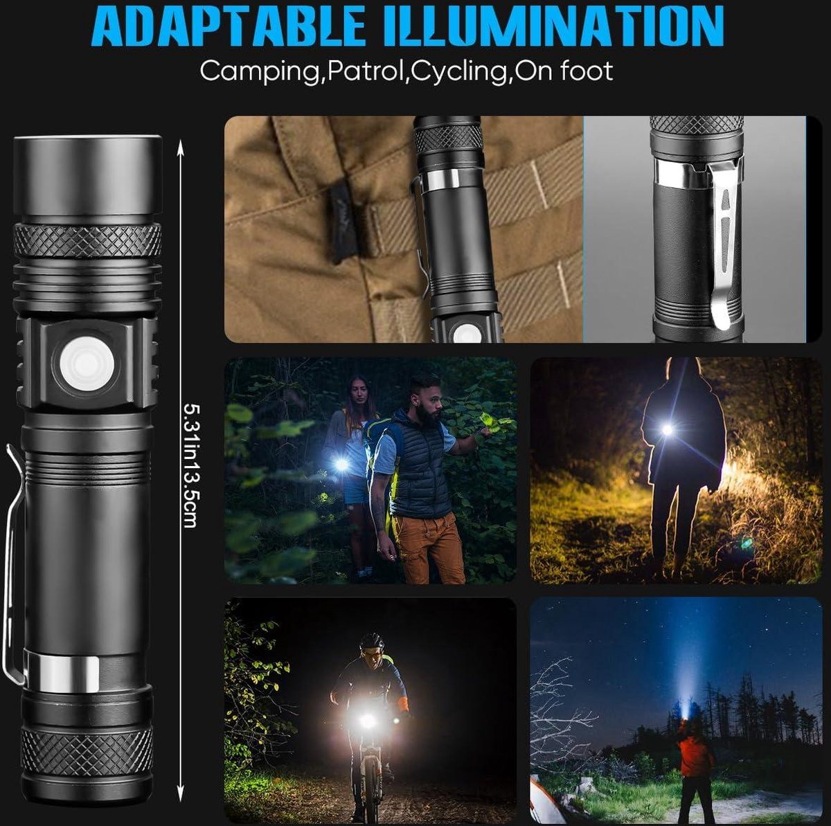 Cet accessoire de camping est le cadeau parfait pour les hommes. Clips latéraux pratiques Le design avec clip latéral le rend facile à transporter. 4 modes d'éclairage 4 modes : haut/bas/stroboscope/SOS. Multitool et lampe de poche LED- outil multifonctionnel pour le camping - rechargeable 1200 lumens - mini lampe de poche 4 modes - zoomable avec clip - cadeau... Puce LED T6 La lampe de poche puissante utilise une puce LED T6 haute efficacité et puissante, 1200 lumens peuvent fournir jusqu'à 600 pieds de lumière forte. Le boîtier en aluminium robuste de qualité militaire le rend adapté aux conditions extrêmes en intérieur et en extérieur. Les piles 18650 fournies vous donnent la liberté de lumière et le circuit de contrôle numérique intégré empêche la surcharge pour plus de sécurité. Lampe de poche en alliage d'aluminium de qualité supérieure. Avec une ampoule CREE T6 haute performance, elle offre une luminosité impressionnante de 1200 lumens, permettant d'éclairer jusqu'à 500 mètres et de couvrir une... LeKaufen Outil multifonction 24 en 1 et lampe de poche LED pour père Veuillez noter qu'une longue pression est nécessaire pour activer le SOS. La lampe de poche légère se fixe facilement sur le côté de votre sac à dos ou sur le côté de vos vêtements avec des poches, ce qui vous permet d'explorer la nature sans avoir à la tenir constamment en main. Matériau robuste et de qualité supérieure : la pince à outils multifonction durable est fabriquée en acier inoxydable 420H de haute qualité, robuste et durable. Lampe Torche Multifonction Lampe De Poche Rechargeable, 1200 Lumens, Portable Ultra Lumineuse Lampes Led Piles Incluses Haute Luminosit Tanche Zoomable Pour Urgence Usage Int Rie Lampe De Poche Multifonction Lampe de poche LED et 4 modes : la mini lampe de poche utilise une puce LED T6 haute efficacité et puissante, 1 200 lumens peuvent fournir jusqu'à 600 pieds de lumière forte. 【Batterie rechargeable et durable】 : la lampe de poche LED rechargeable a une durée de vie de plus de 100 000 heures. Boîtier en aluminium robuste et haute résistance aux chocs. Lampe de poche LED solaire multifonction pour voiture, idéale pour les Portable et de petite taille, cette lampe de poche est pratique à ranger dans votre poche, boîte à gants, équipement de camping ou équipement de survie. Cadeaux pour hommes qui peuvent offrir des cadeaux pour les hommes. Vous pouvez charger complètement les 8 piles fournies et les emporter avec vous lors de longues activités de plein air, ce qui vous offre un éclairage extra long et vous protège de l'obscurité et des dangers. Vous pouvez compter sur cela pour les tempêtes, les inondations, les pannes de courant, les tremblements de terre et les catastrophes naturelles. Il est complètement chargé en seulement 3 heures et peut être chargé sur n'importe quel port USB.