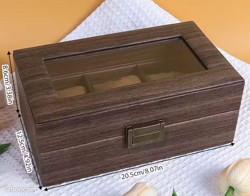 Dimensions totales du Commander : 34,9 cm de large x 29,2 cm de profondeur x 14,2 cm de haut., Prêt à offrir. Le Commander fait une impression très sérieuse sur celui qui a la chance de recevoir ce valet de commode orienté montre en cadeau. La doublure intérieure douce en daim marron foncé et les coussins de montre sont agréables au toucher et protégeront vos montres, couteaux et bijoux des rayures. Boite à montre 3 emplacements marron/beige - Coffret Montre Boite Rangement Montre HOUNDSBAY Commander Commode Valet Boîte à Bijoux Pour Homme Boite De Rangement Pour Montre Doté d'une construction robuste avec des matériaux de haute qualité, ce valet de boîte à montres est conçu pour durer. Fabriquée avec une attention méticuleuse aux détails, cette boîte à montres élégante et sophistiquée est conçue pour répondre aux besoins de l'homme moderne. Il fait une impression sérieuse sur celui qui a la chance de recevoir ce valet de commode comme cadeau. Améliorez votre organisation avec notre boîte de présentation haut de gamme combinée à un plateau de valet – le Commander, la solution ultime pour ranger et mettre en valeur vos précieux montres et accessoires. Les sections profondes et les tiroirs offrent beaucoup d'espace pour ranger portefeuilles, stylos, bagues, boutons de manchette, lunettes, etc. Achetez en toute confiance. Un Plateau De Présentation Offre Une Solution Pratique Et Esthétique Pour Mettre En Valeur Vos Colliers, Chaînes Et Pendentifs. Fabriqué En Plastique De... Commandez maintenant et améliorez votre jeu de stockage C’est un moyen simple et efficace pour trouver des promotions et des réductions intéressantes afin de commander moins cher. Des dizaines de nouveaux produits sont ajoutés tous les jours ! Breveté par HOUNDSBAY, et inspiré du populaire HOUNDSBAY Admiral, cette grande boîte de rangement combine une station de charge surdimensionnée, un plateau fourre-tout, un tiroir d'accessoires et un boîtier de montre à grande fente sous un couvercle en verre véritable. Dans un coffret cadeau texturé noir lourd qui ajoute vraiment au facteur « WOW ». Le Commander est le valet de la commode des amateurs de montres. Que vous soyez un amateur de montres cherchant à afficher votre collection ou simplement besoin d'une solution de rangement pratique pour vos accessoires, ce valet de boîte de montre est le choix parfait. Le tiroir a une section spéciale pour les bagues et les boutons de manchette.