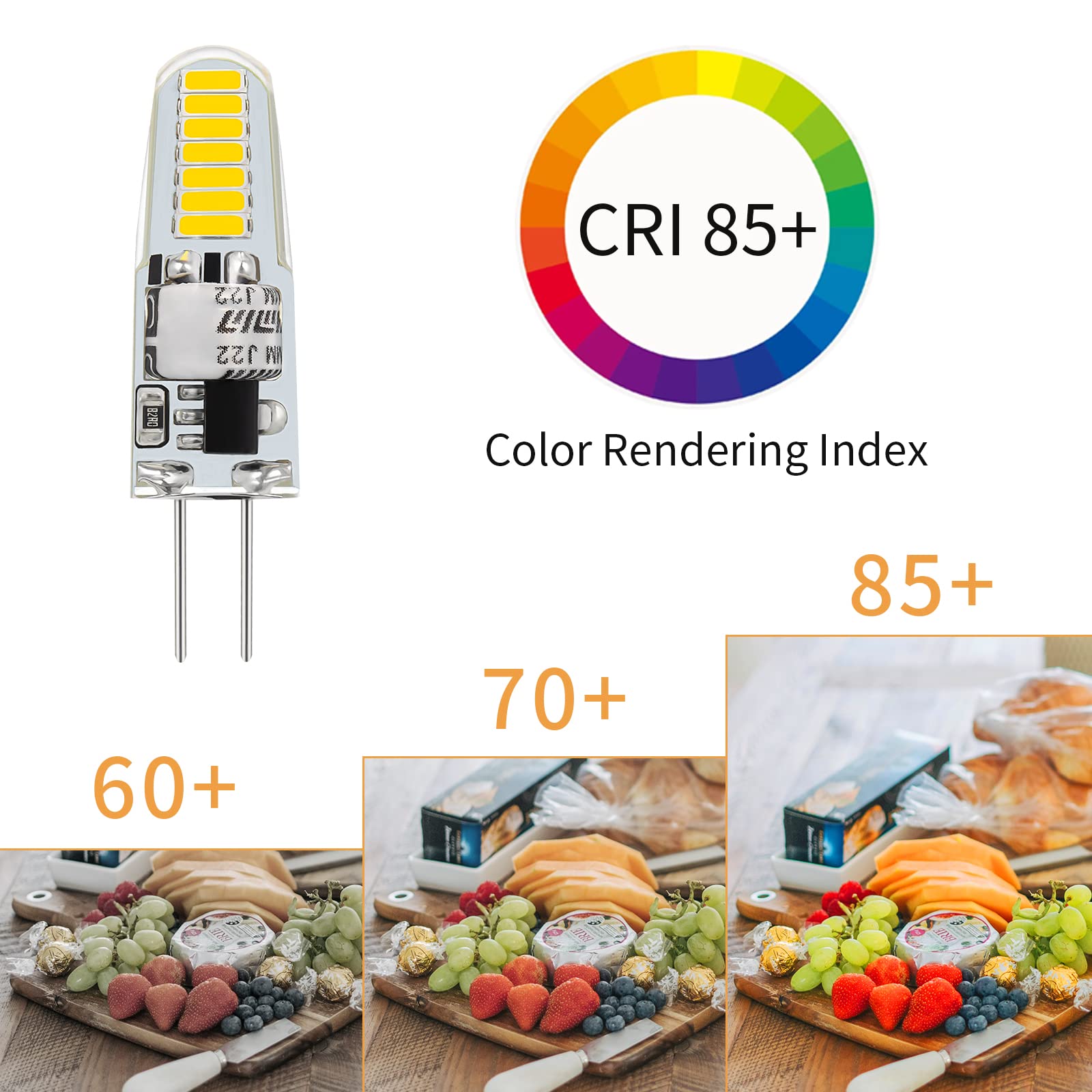 Angle d'éclairage : 360°. Culot : G4 - Flux lumineux : 130-150 lm - Tension : AC/DC 12 V - Angle de faisceau : 360 degrés. Applications]: G4 12V LED 2W est idale pour hotte aspirante, hotte cuisine, meuble cuisine, meuble de salle de bain, salon, camping-car, caravane, armoire, bateau, cabine, hall d'entre, terrasse, etc. C'est un choix idal pour les lustres de salon et de chambre Cette lampe a une agréable lumière blanc froid (6000-6400 K), émet un pastel lumineux et une lumière agréable. Plus la lumière vive et la lumière du jour., 6., Faisceau large. Dimensions : 9,6 x 35,5 mm Température de couleur : blanc froid (6000-6400 K). Couleur : 10 LED G4 blanc froid. Angle de faisceau de 360 degrés, LED octaédrique, aspect exquis, protection en silicone transparent, uniformité des couleurs de la lumière. Caractéristiques : Culot : G4., Matériau : aluminium Tension : 12 V CA/CC., Puissance : 2 W. Imperméabilisation nécessaire pour une utilisation en extérieur. Fiable et support client : fabriqué à partir de silicone pour la dissipation de la chaleur. Sans UV et sans mercure. Couvert par une garantie de 1 an pour la fiabilité Fabrication de qualité, conforme aux normes CE et RoHS, pas de mercure, pas d'émissions UV. Ampoule G4 12v 20w Lot De 10 Ampoules LED G4 à Culot à Deux Broches, Encapsulation En Sil Ampoule Led 12v Sans rayonnement thermique UV ou infrarouge. Caractéristiques du produit : 1., Économisez plus de 90 % sur la facture d'électricité., 2., Installation facile : peut être facilement installé pour remplacer les ampoules halogènes G4 ordinaires., 3., Durée de vie extrêmement longue : faible coût de maintenance grâce à la réduction de la fréquence des ampoules de rechange., 4., Flash complet : le temps de démarrage est inférieur à 0,5 s, pas besoin d'attendre que la lampe se réchauffe., 5., Température de couleur standard, IRC élevé. Si vous n'avez pas reçu de message, veuillez vérifier le spam. Résiste aux chocs et aux vibrations., 9., Émissions sûres. Lot de 10 ampoules LED G4 à culot à deux broches, encapsulation en silicone, 12 V, 2,5 W, 1508 LED COB, IRC > 80, 230-250 lumens, AC/DC 10-20 V, équivalent 25 W, LED halogène de remplacement