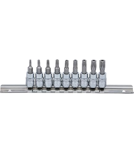 Jeu de 9 embouts TORX 5 branches Embouts TORX 5 branches (les torx normaux ont 6 branches)Type Tamper (percés) Carré de 1/4 :Douilles TS10 - TS15 - TS20 - TS25 - TS27 - TS30 et TS40 Carré de 3/8 :Douilles TS45 et TS50 Indispensables sur les vis Torx étoiles à 5 branches FACOM - Jeu de 10 embouts Torx plus Tamper Résistant 1/4 25 mm - E Contenu: Douilles Resistorx 1/4`` TS10 - TS15 - TS20 - TS25 - TS27 - TS30 - TS40 (32mmL) Douilles Resistorx 3/8`` TS45 - TS50 (50mmL Torx Plus EMBOUTS TORX 5 PANS (branches) PERCE Coffret Torx Lot de 3 coffrets d'embouts BTR TORX XZN 6pans Torx 12 pans Widmann - D...