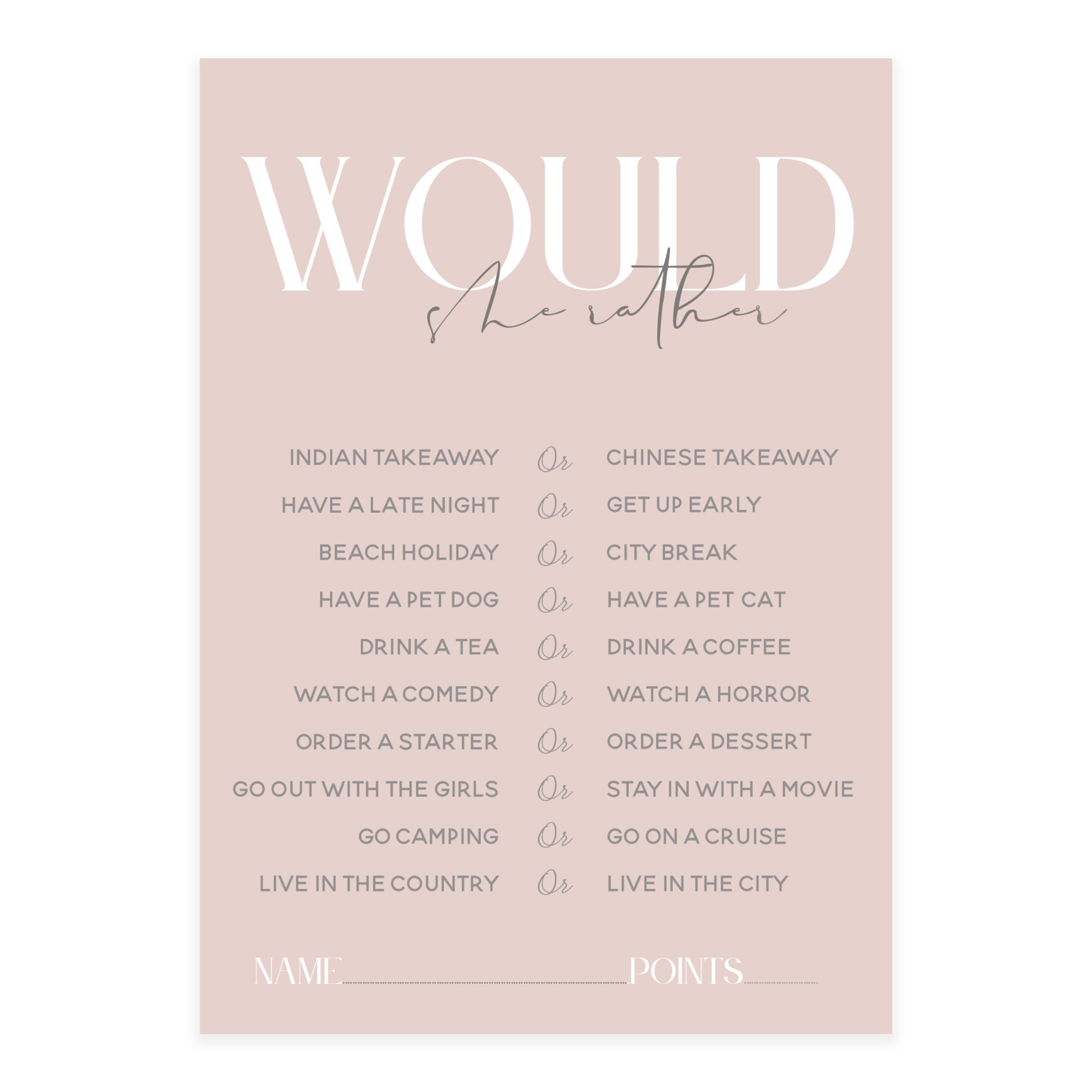 Dans un beau style minimaliste rose poudré. Cartes format A6 : 148 mm x 105 mm OG Would She Rather Cartes de jeu pour fête prénuptiale, jeux de fête Bridal Shower Game PDF Jeu De 30 Cartes Pour Fête Prénatale - « Would She Rather Bachelorette Game Dirty Taille parfaite : chaque carte mesure 12,7 x 17,8 cm, idéale pour une manipulation et une présentation faciles. Amusement instantané : nos cartes roses « Would She Rather » sont livrées avec tout ce dont vous avez besoin, ce qui permet de rassembler tout le monde pour un moment de joie et de lien sur les préférences de la future maman...
